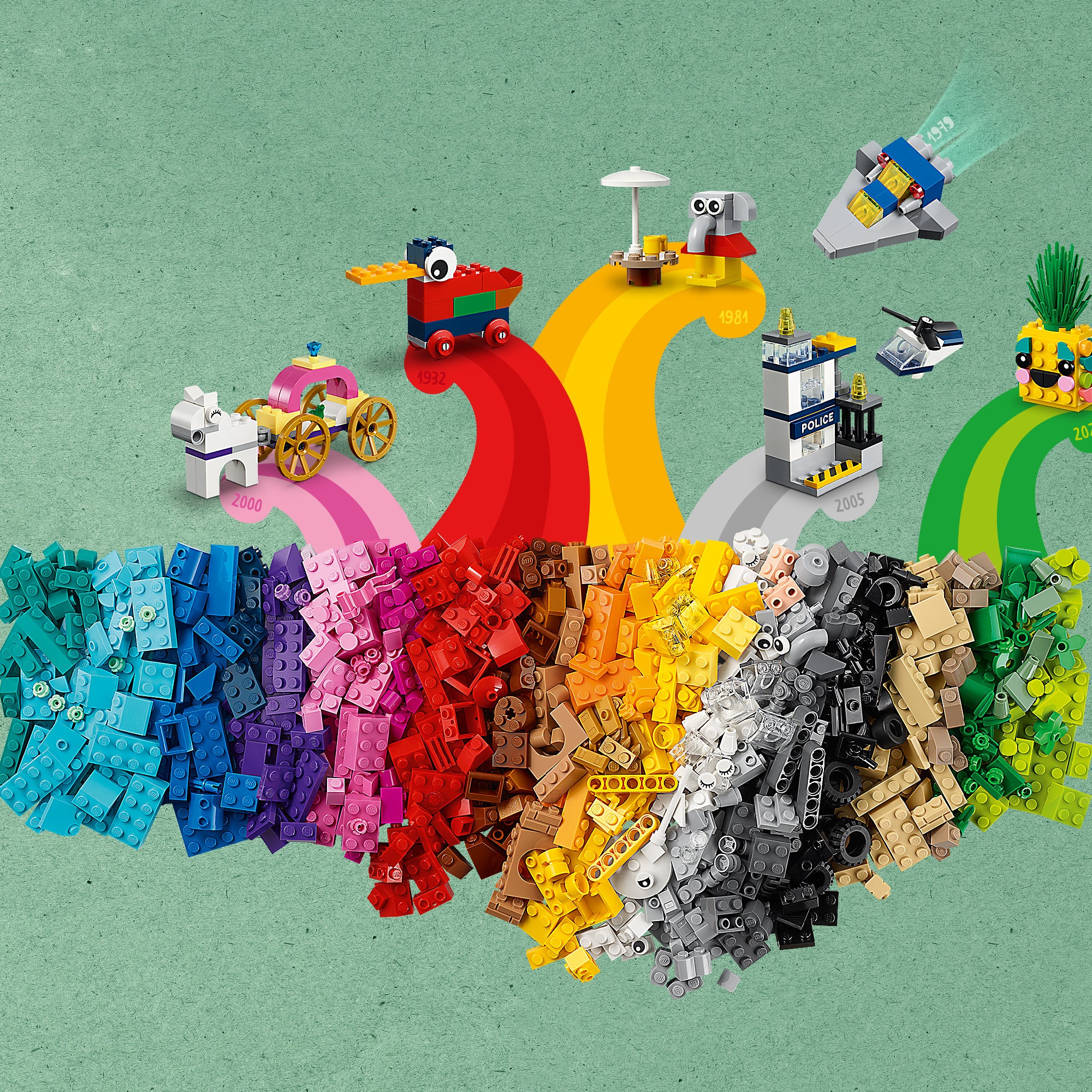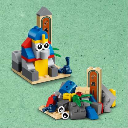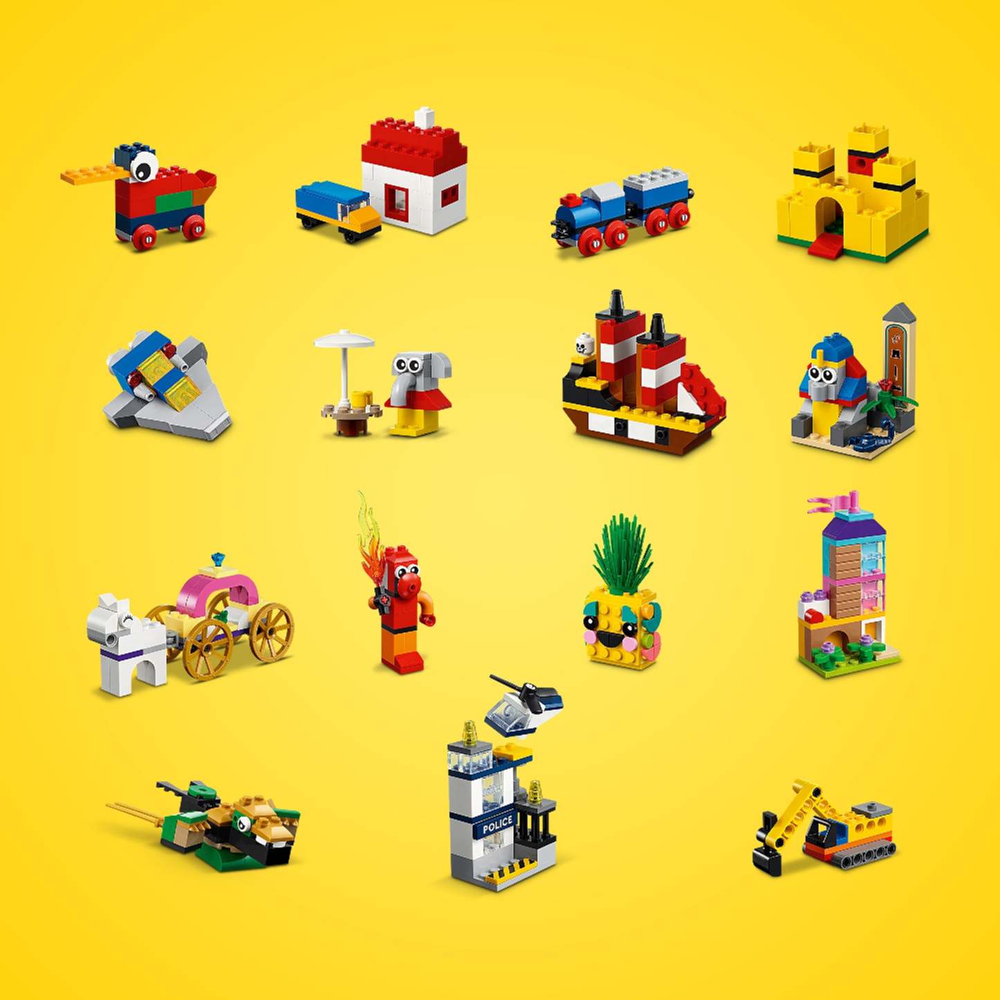 - What’s in the box? – All you need to construct 15 mini build recreations of iconic LEGO® toys, from a pirate ship to an elephant or yellow castle, plus lots of extra LEGO bricks for free building
