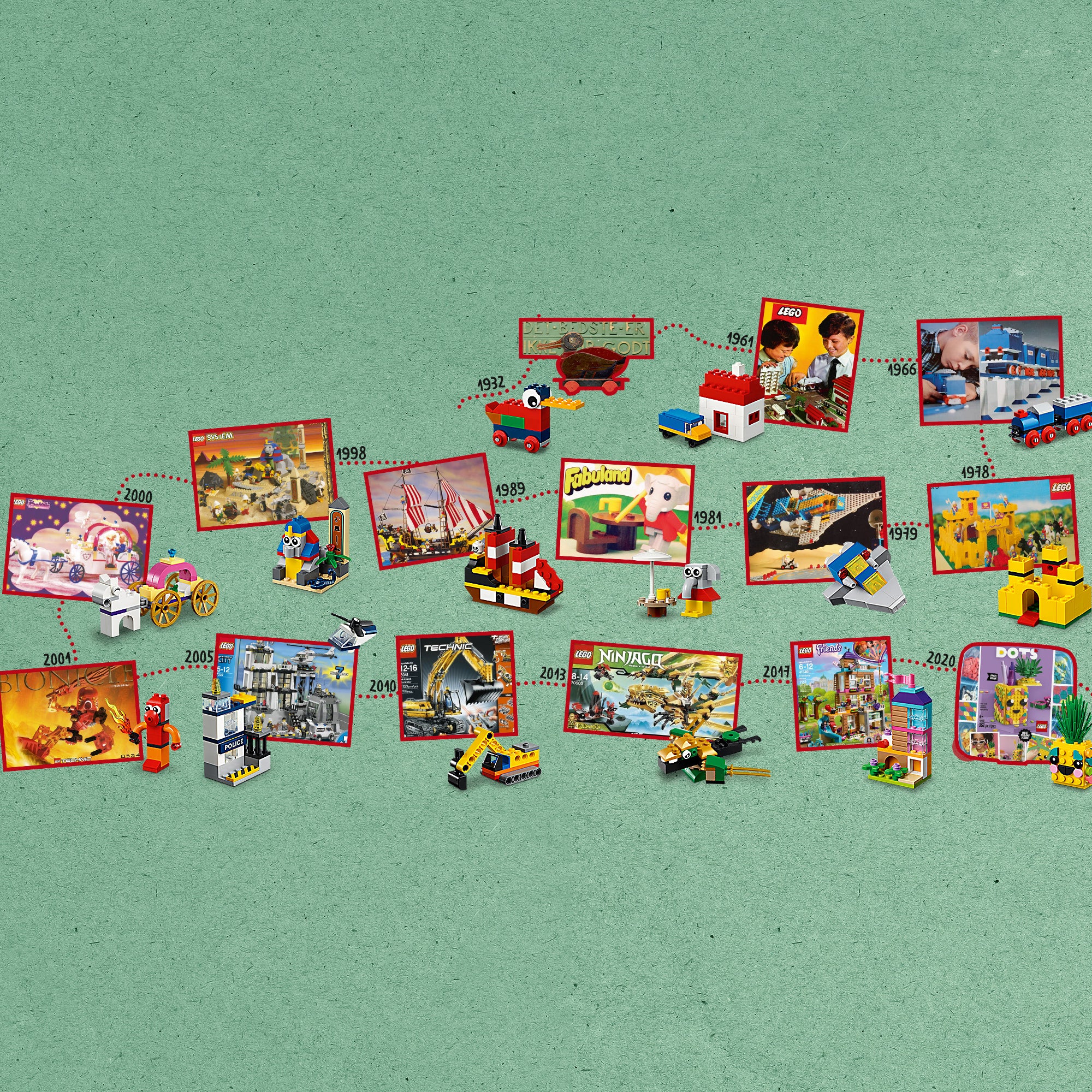 - Celebrating 90 years of playful learning – 15 Toy mini build recreations, including the 1998 Secret of the Sphinx, 2001 LEGO® BIONICLE® Tahu and the 2013 LEGO NINJAGO® Golden Dragon
