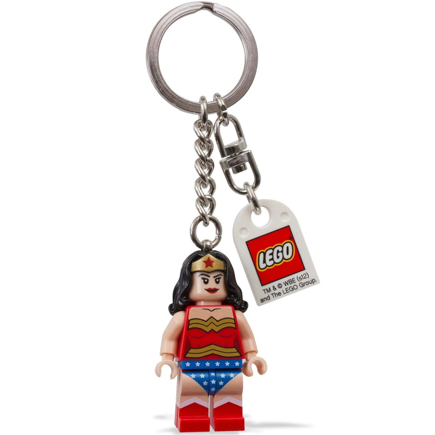 - Features authentic LEGO® Super Heroes Wonder Woman minifigure attached to a sturdy metal ring and chain