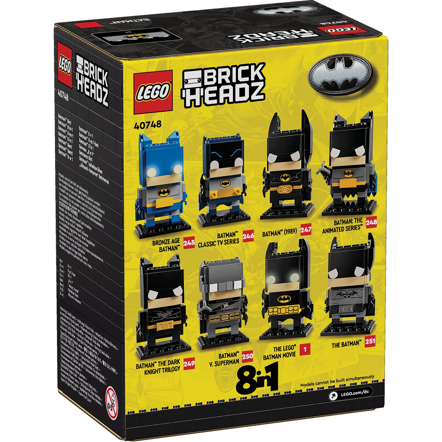 With LEGO® BrickHeadz™ Batman™: Batman 8in1 Figure (40748) kids can build their Batman model in any of the following styles: (1) Bronze Age Batman; (2) Batman Classic TV series; (3) Batman (1989); (4) Batman: The Animated Series; (5) Batman The Dark Knight Trilogy; (6) Batman v. Superman; (7) The LEGO Batman Movie, with glow-in-the-dark eyes; and (8) The Batman. This 8in1 BrickHeadz set makes a great gift for kids aged 10 and up to build, play with and display.