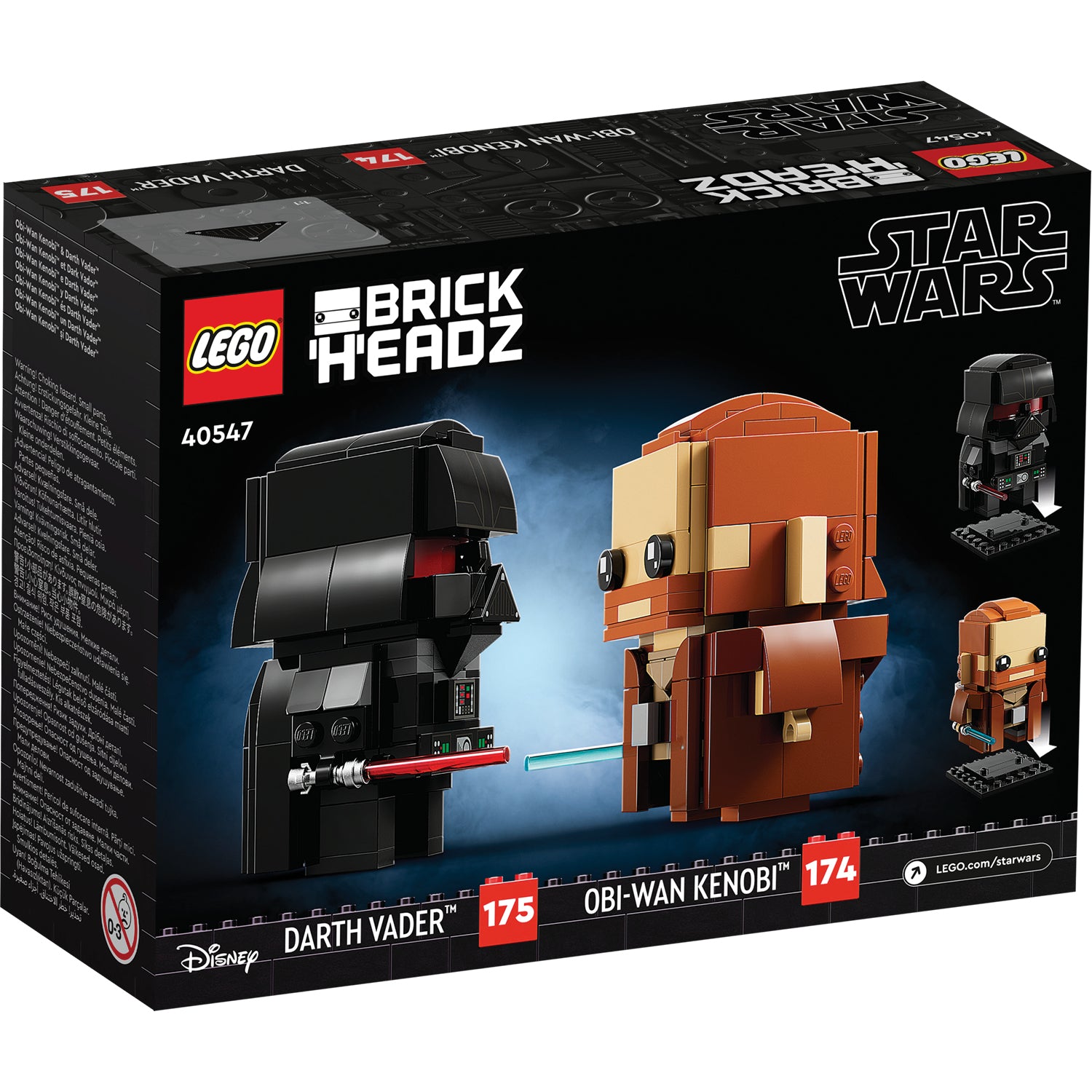 - Iconic Star Wars™ characters in LEGO® BrickHeadz™ style – Buildable LEGO BrickHeadz figures of Obi-Wan Kenobi and Darth Vader (40547) with lightsabers
