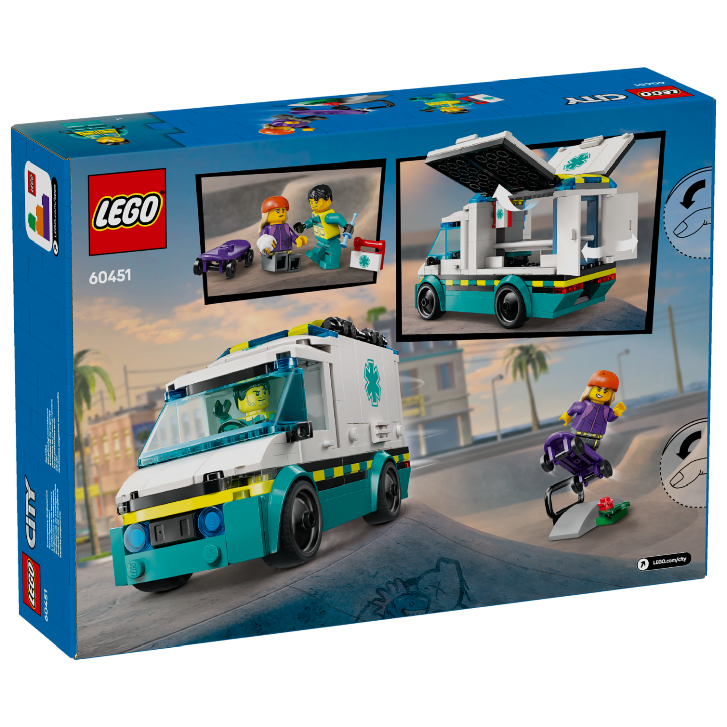 Action-packed rescue missions await with this LEGO® City Emergency Ambulance toy (60451) for ages 5 and up. Kids can fold up the side panels and open the rear doors for easy access to the onboard stretcher and medical equipment, including a toy syringe, bandage and medic bag. The set also includes a skateboard and skate ramp setting, plus skateboarder and paramedic minifigures for fun role play and storytelling.