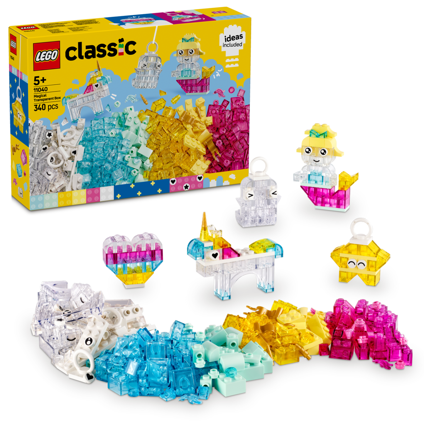 LEGO® Classic Magical Transparent Box (11040) will provide creative fun that lasts and lasts. With 340 colorful bricks, many of them transparent, plus a variety of special elements, this build-and-display set inspires kids’ creativity with enchanting models and endless imaginative play.