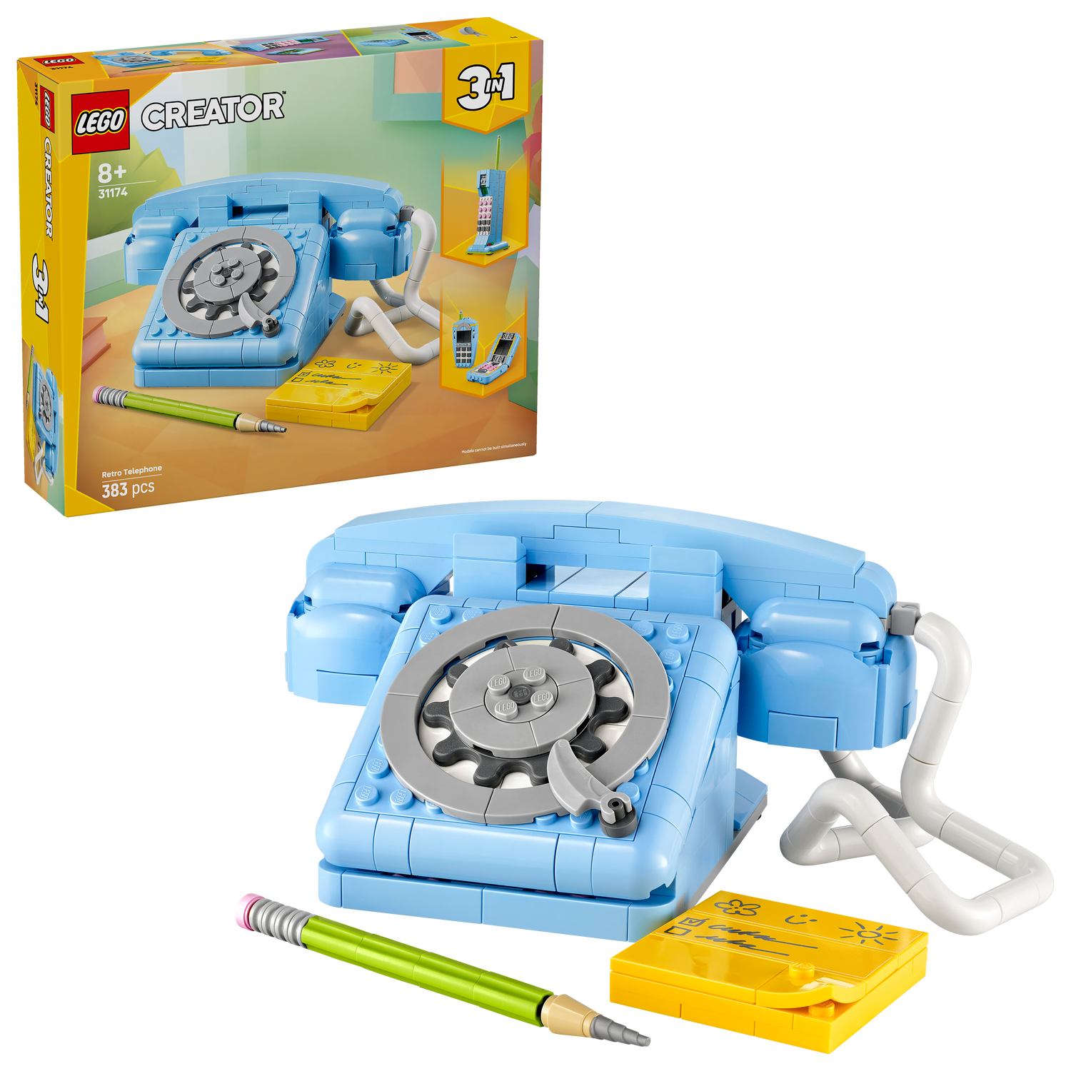 - 3 retro phone playset building options in 1 box – The LEGO® Creator 3in1 Retro Telephone lets kids aged 8 and over build and rebuild 3 different retro-style model sets with the same bricks