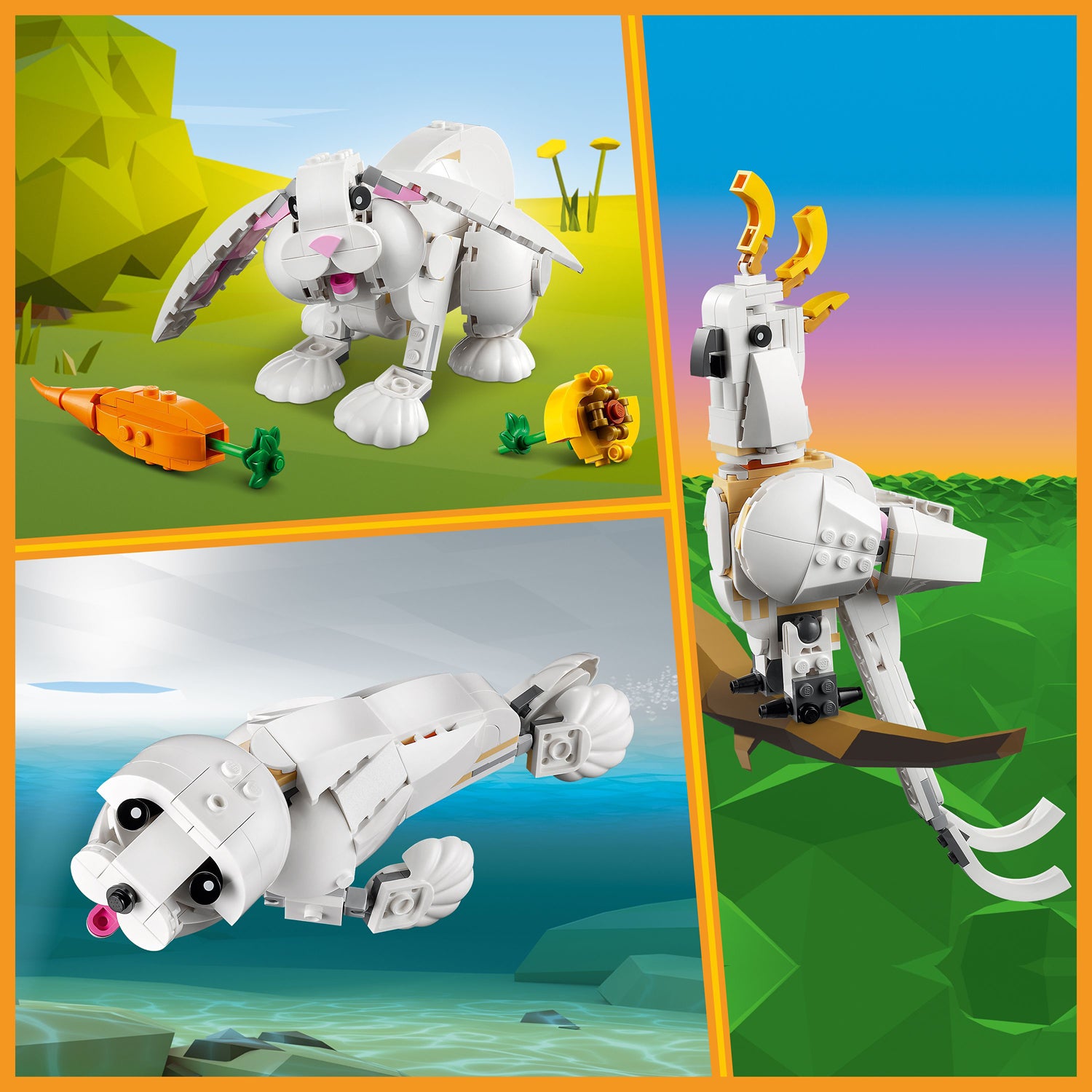 - 3in1 toy – Animal lovers can enjoy endless creative fun with the LEGO® Creator 3in1 White Rabbit (31133) playset, featuring 3 toy models in 1: a White Rabbit, a cockatoo parrot and a white seal