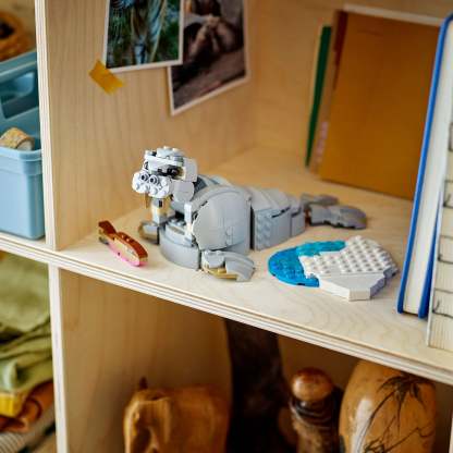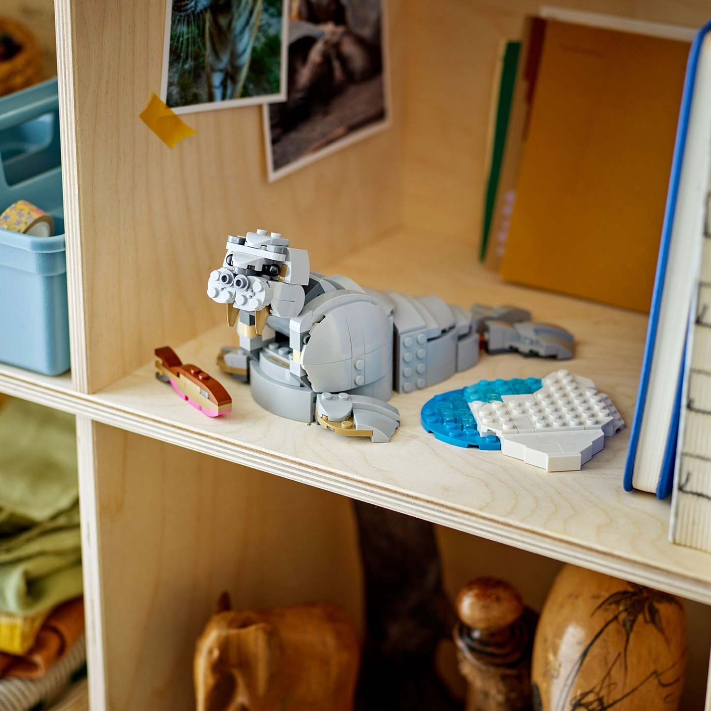 Kids have 3 different LEGO animal figure playset building options with the same bricks: a posable rhino toy with a snail, 4 birds and a patch of grass; a posable hippo toy with 2 birds and a patch of grass; or a posable walrus toy with a fish and a patch of ice and water. All 3 animal figure scenes make a great LEGO gift for kids.