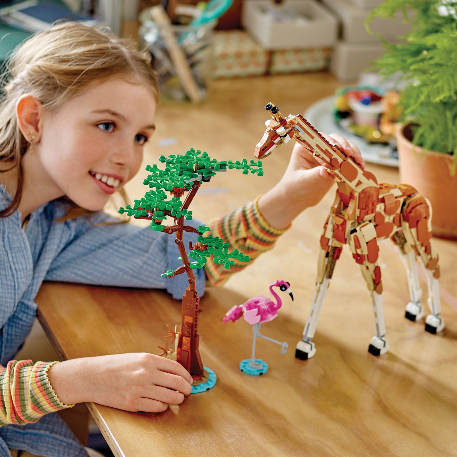 This LEGO set offers kids a world of play possibilities with 3 different animal toys to build using the same bricks. They can build a posable giraffe toy with a tree and a flamingo, rebuild it into 2 posable gazelle toys, a mother with her calf, plus 2 bushes, or turn it into a lion toy with a tree and a butterfly.