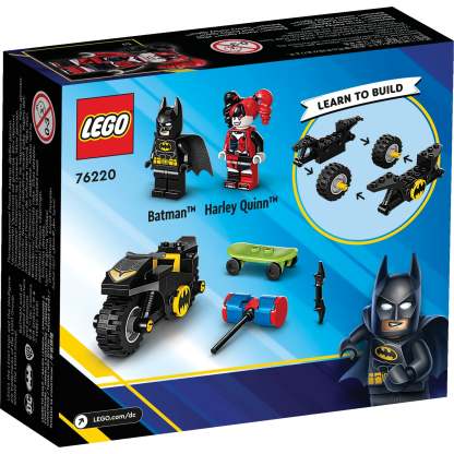 LEGO® DC Batman™ versus Harley Quinn™ (76220) features classic characters, cool vehicles and awesome accessories to engage kids aged 4 and up in shared, developmental play. The best start for young superheroes This action-on-wheels playset features 2 popular characters from the DC Super Hero movies: Batman riding his powerful Batcycle™ and Harley Quinn riding her skateboard, with an oversized mallet in her hand. LEGO 4+ sets are packed with engaging details to give youngsters the best play experience. Inside the box, each bag of bricks contains a complete model and character that kids can assemble for play right away. A large motorcycle Starter Brick is included to kick-start the construction, and intuitive instructions are provided in the form of a colourful picture-story guide. Great fun for families 4+ sets are the perfect way for adults to share the building fun with youngsters, whether they are a seasoned LEGO fan or are experiencing LEGO bricks for the first time.