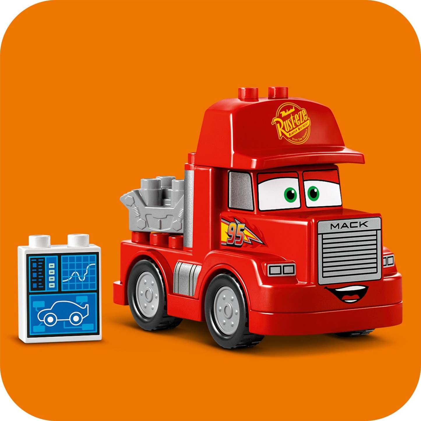 - LEGO® DUPLO® truck with creative accessories – Includes a drivable and buildable model of Disney and Pixar’s Mack from the Cars movies, plus a brick-built tuning station, engine brick and a cone