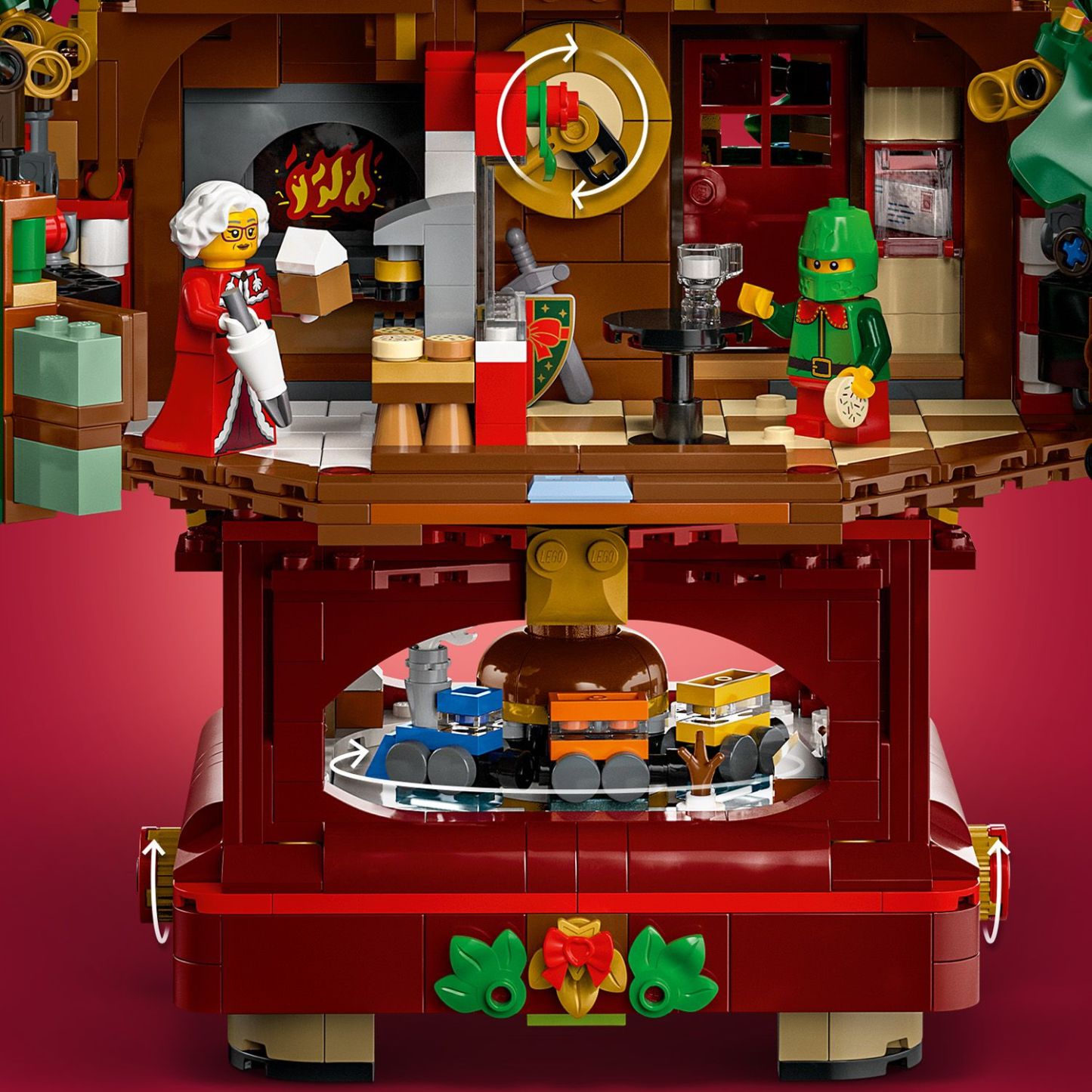 - LEGO® collectible toy with functions – Hinged panels open to reveal the rooms, knobs make the train run and change the time on the kitchen clock, and the tree separates for storage
