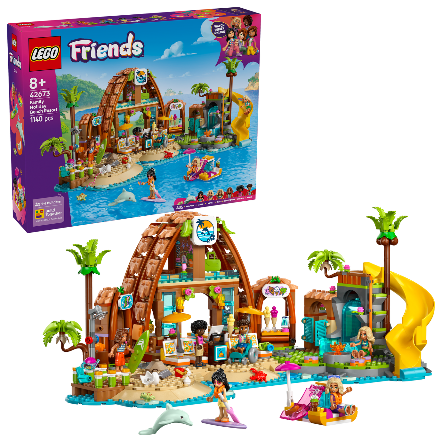 - Family fun – This Family Vacation Beach Resort building set for girls, boys and kids aged 8 years old and up comes with 6 minidolls, a dolphin and a turtle figure, plus accessories for creative play