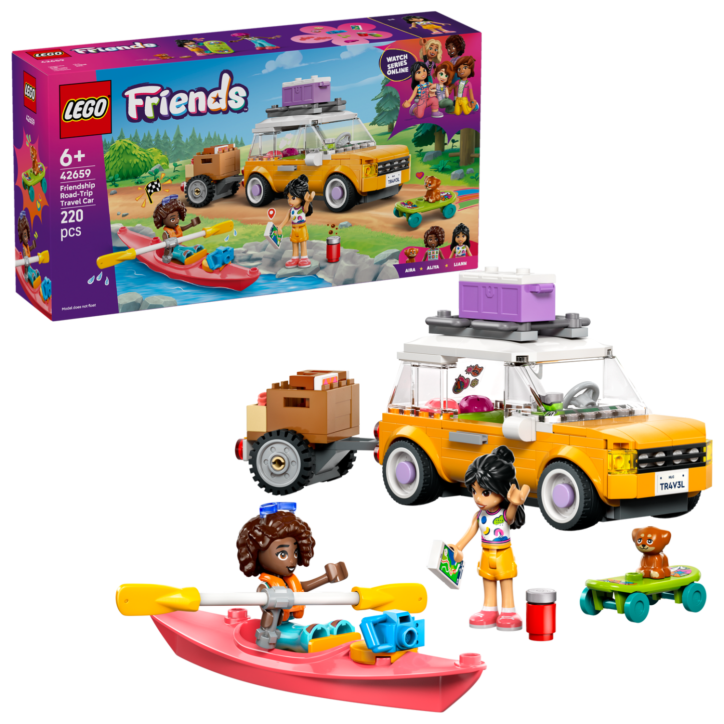 Take kids on a journey of creativity as they help Liann and Aliya pack the car and removable trailer with everything they need for their road trip. The friends sit up front, and there’s a seat for Aira the dog in the back of the car. Accessories include a kayak, 2 helmets, a skateboard, in-line skates, 2 chairs and a cooler containing a sandwich, donut, cookie, cherries and a pet treat. When it’s time for a snack, the cooler doubles as a picnic table.