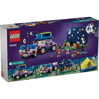 Kids who love adventure toys have lots to discover with this LEGO® Friends Stargazing Camping Vehicle (42603) playset for girls, boys and kids aged 7+. The set includes a buildable toy telescope, a 4x4 vehicle with camping trailer and self-folding tent, 2 mini-dolls, a dog figure and a hedgehog figure.