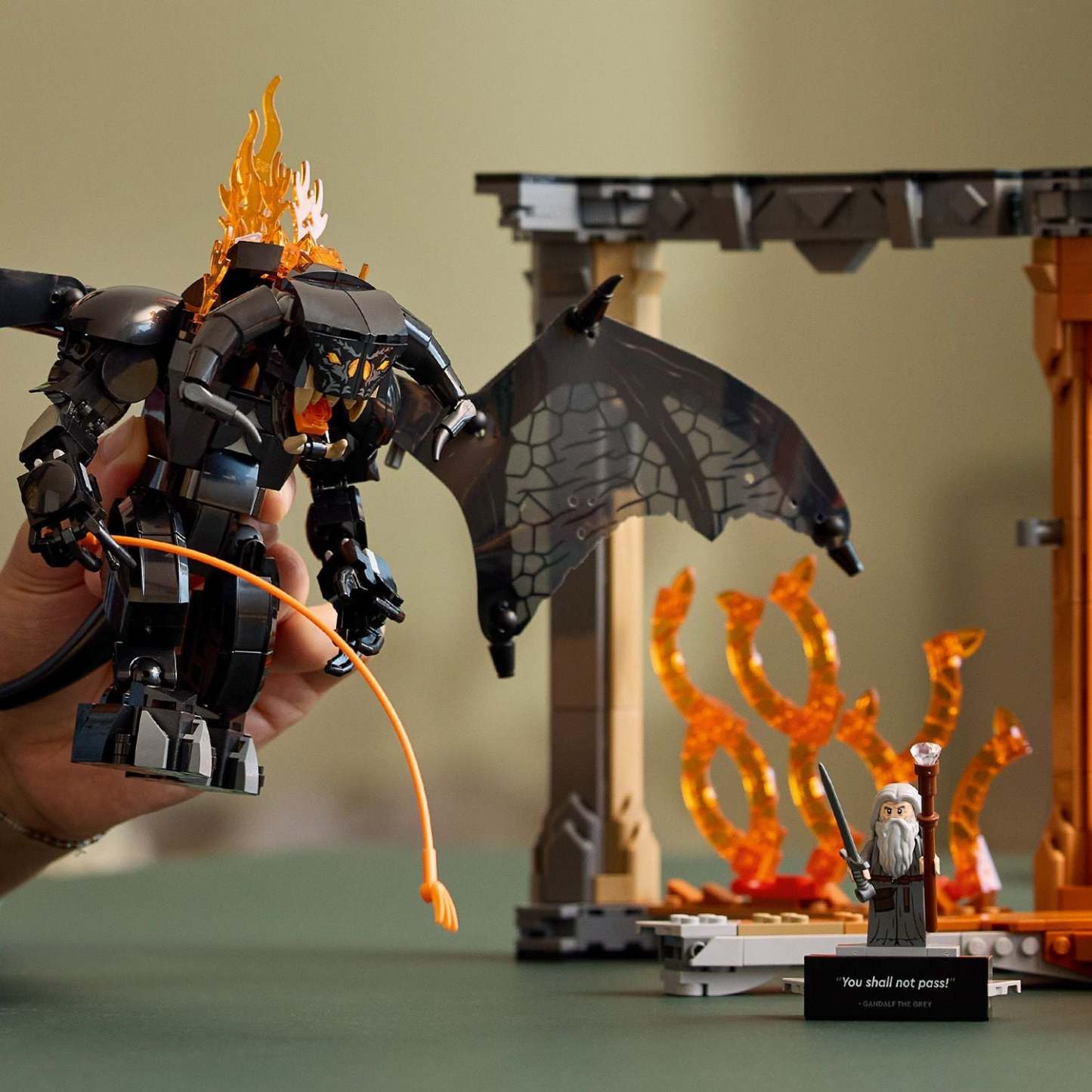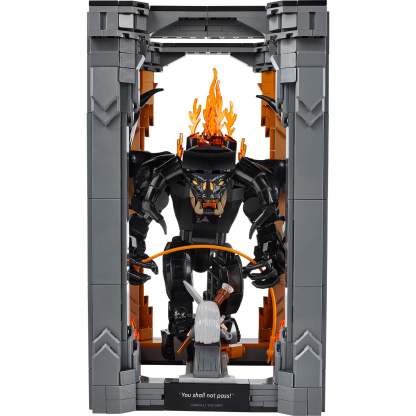 Bearing a plaque with the words ‘You Shall Not Pass’, the model depicts Gandalf the Grey™ in a fearless stance and the Balrog with its mighty wings unfurled against a blazing wall of flames. Both characters are detachable and the Gandalf minifigure has a staff and sword, while the Balrog figure wields a fiery whip and features posable limbs and wings for dynamic display.