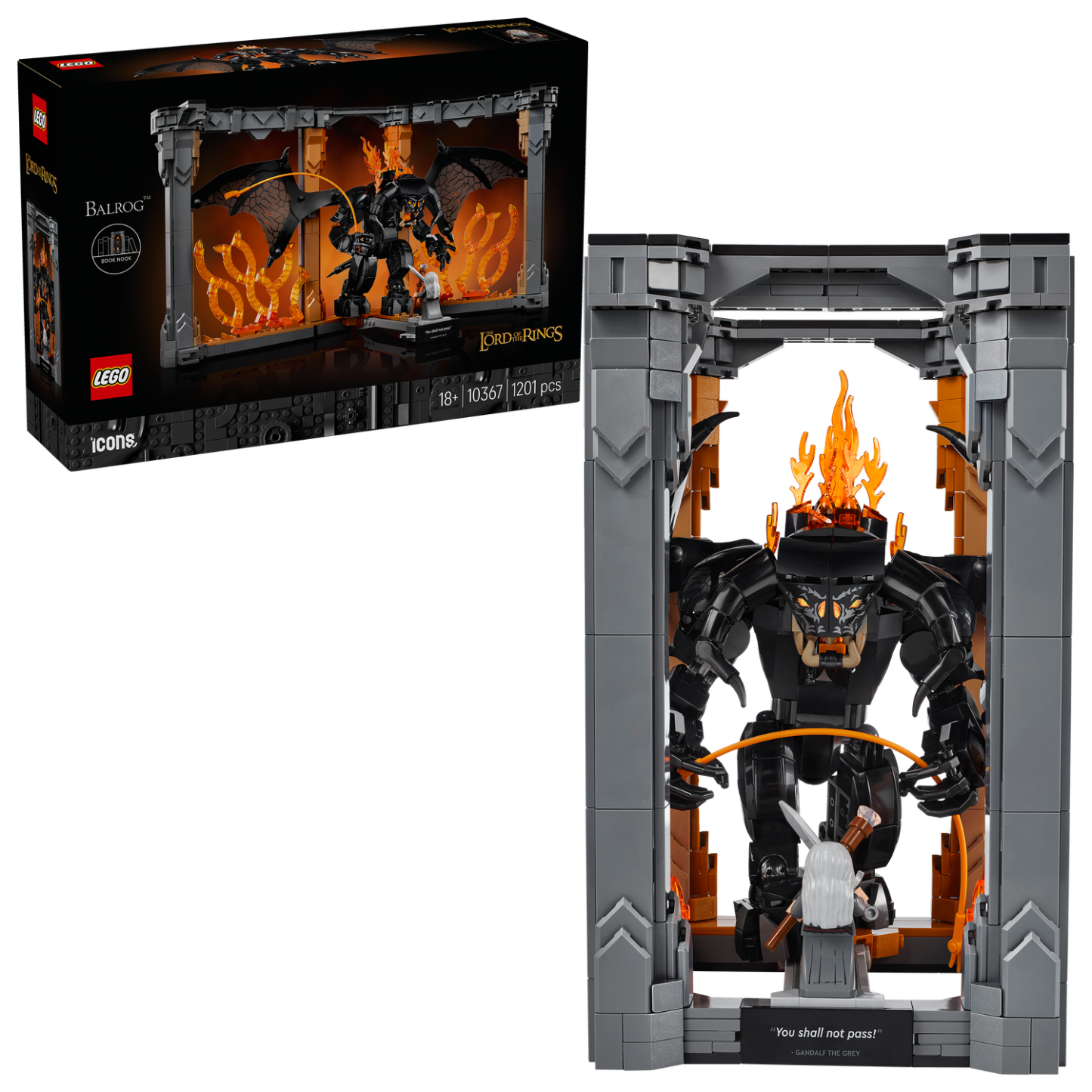 - What’s in the box – Includes all you need to build the LEGO® Icons The Lord of the Rings: Balrog™ Book Nook, a Balrog figure with a fiery whip and a Gandalf the Grey™ minifigure with a staff and sword