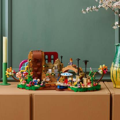 - LEGO® brick-built authentic details – The chocolate waterfall with colourful pipes, Wonkatania boat, work area for the Oompa Loompas, Willy Wonka’s office with a secret door, candy plants, and more