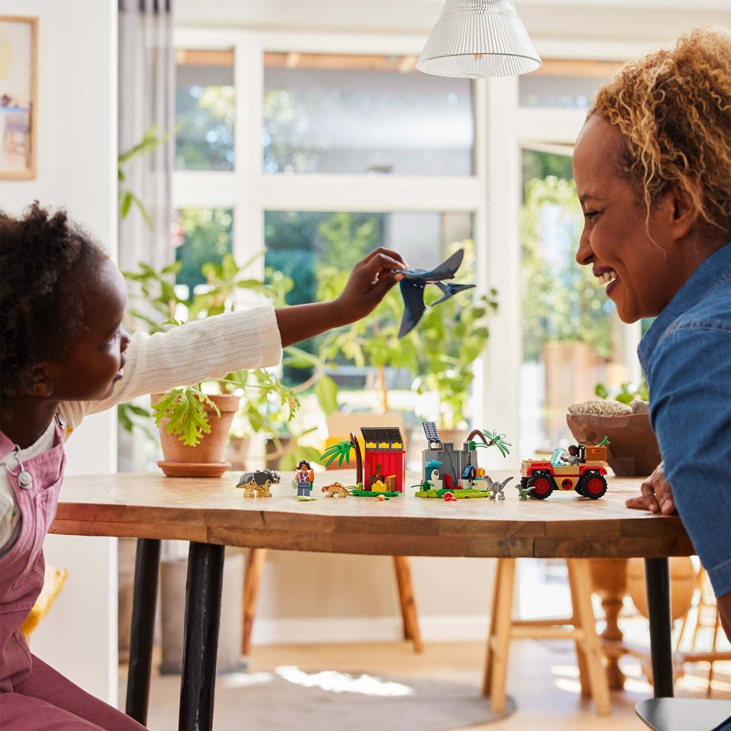- Dinosaur research center – The 5 dinosaur toy figures include a baby Ankylosaurus, Triceratops and Velociraptor, a small Velociraptor and an adult Pteranodon, plus Darius and Sammy minifigures
