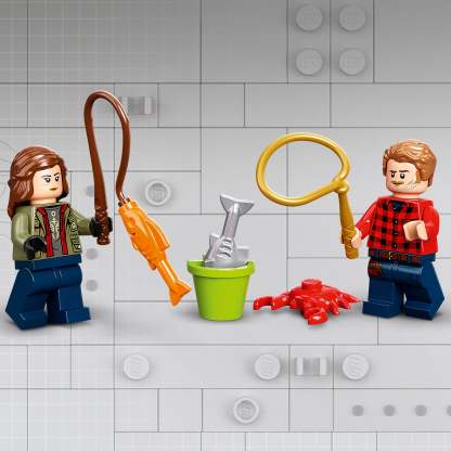 - Quick-build buggy and dock – The toy buggy has a Starter Brick chassis to make building easier, and a seat for Owen Grady. The dock features a stall with fish and crab elements