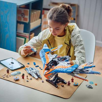 Based on the starship from the first Guardians of the Galaxy movie, this buildable toy features 6 adjustable wings and 4 moveable rear boosters. The top of the spaceship model lifts off to reveal a detailed interior with 3 distinct areas: a flight deck with room for 3 minifigures, a communal area with an additional seat and storage space for weapons, and a rest area with a bed and a tape deck (a key element in the movies). There are Star-Lord, Gamora, Drax and Rocket minifigures, plus a Baby Groot figure. A stand allows the spaceship to be displayed. The LEGO Builder app lets kids zoom in and rotate models in 3D using their digital device.