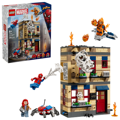 The buildable set contains 4 minifigures: Hobgoblin on his glider with pumpkin bombs; Spider-Man and Anti-Venom blasting webs; and Mary Jane with a jointed spider robot. A giant, flexible web attached to the building can trap a minifigure. On the apartment’s ground floor is a kitchen. The first floor has a study and bedroom containing a flip-up bed, desk, computer, camera and a microscope. A push-button function makes part of the building collapse. Kids can connect this build-and-play set to Spider-Man vs. Oscorp (76324) and stack it on top of Spider-Verse: Miles Morales vs. The Spot (76311) for an even bigger play experience. Contains 394 pieces.