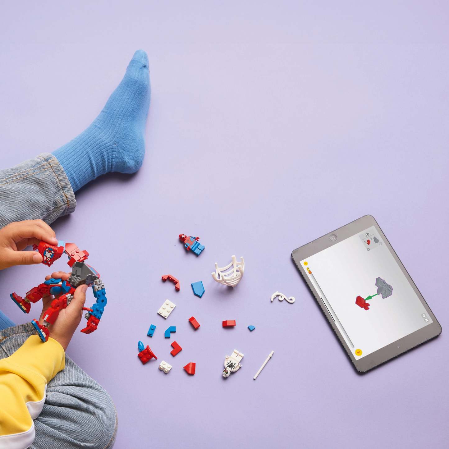 - Spider-Man Mech buildable figure – The LEGO® Marvel mech has movable arms, legs and fingers, and the torso opens to reveal a cockpit that can hold the Spider-Man minifigure