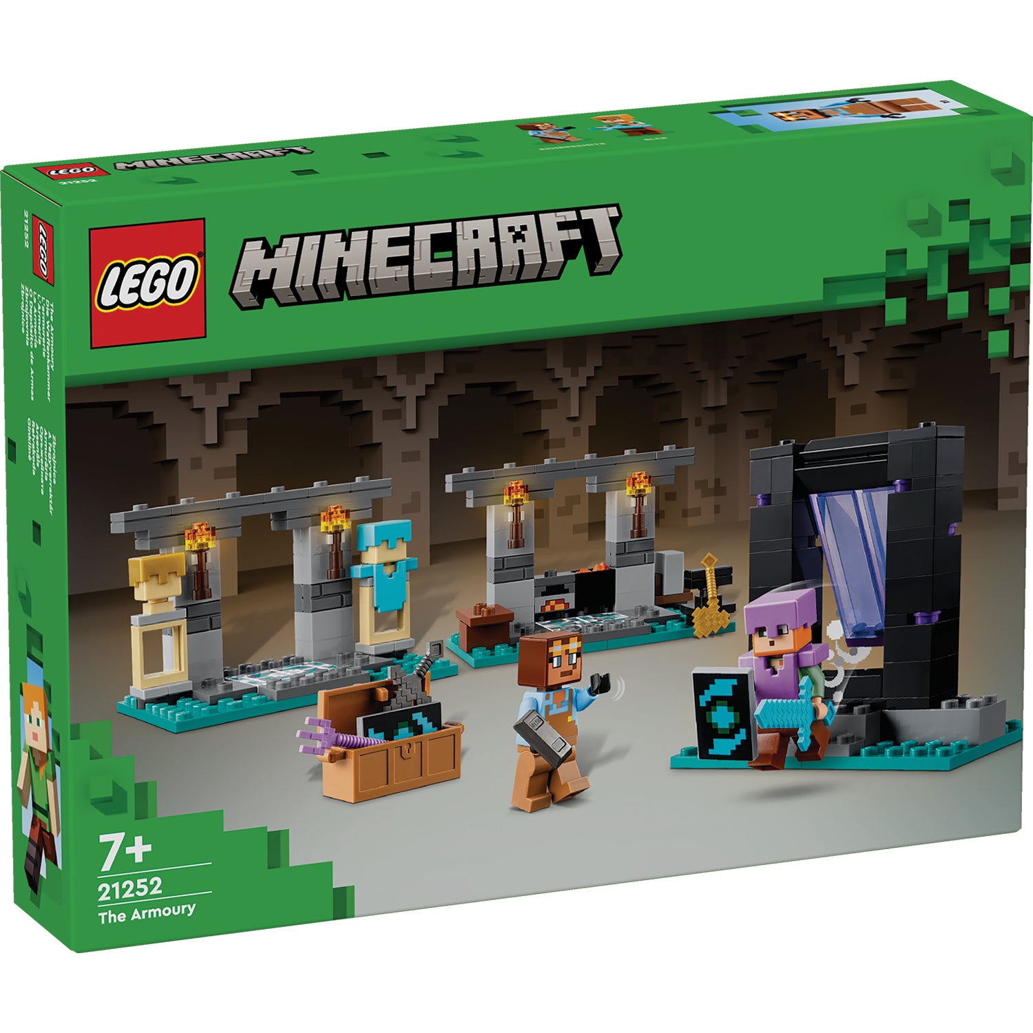Minecraft® players aged 7 and up will love to get hands-on with the Minecraft weapons and features in The Armory (21252). This LEGO® Minecraft building kit is a great gift idea for kids, providing players with the perfect gateway to creative Minecraft adventures. This buildable gaming toy for kids includes 2 familiar figures: Minecraft action hero Alex, with her shield and diamond sword, and the industrious Armorsmith. There are 3 environments to explore: the work area, with an anvil, furnace, grindstone and lava-filled cauldron; the armor display room, with its chest containing a golden axe, enchanted trident, netherite sword, shield and other Minecraft resources; and the Nether portal, with its swinging-door entrance to players’ next adventure. This Minecraft adventure toy is also a role-play extension set, combining easily with other LEGO Minecraft sets, particularly The Nether Portal Ambush (21255), sold separately.