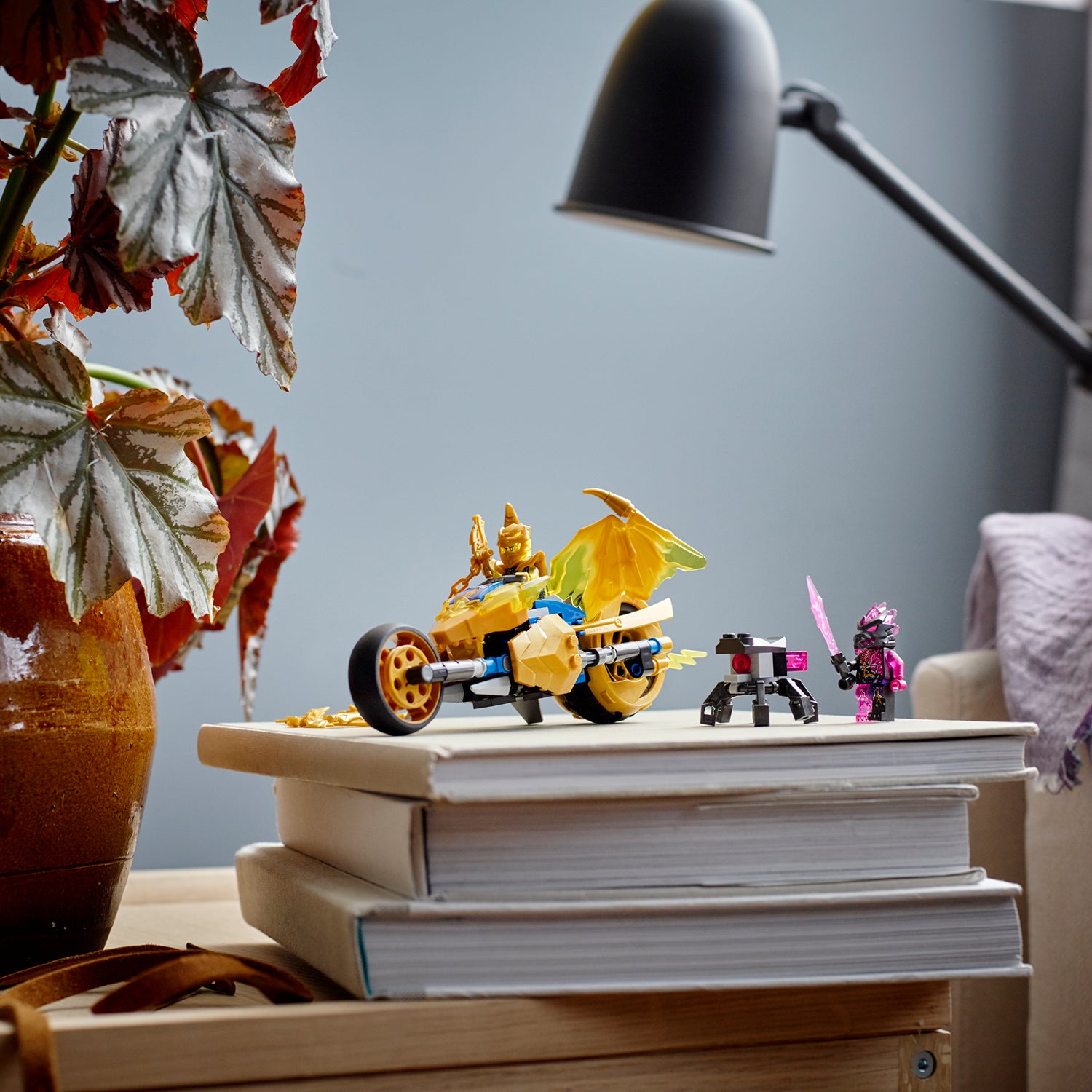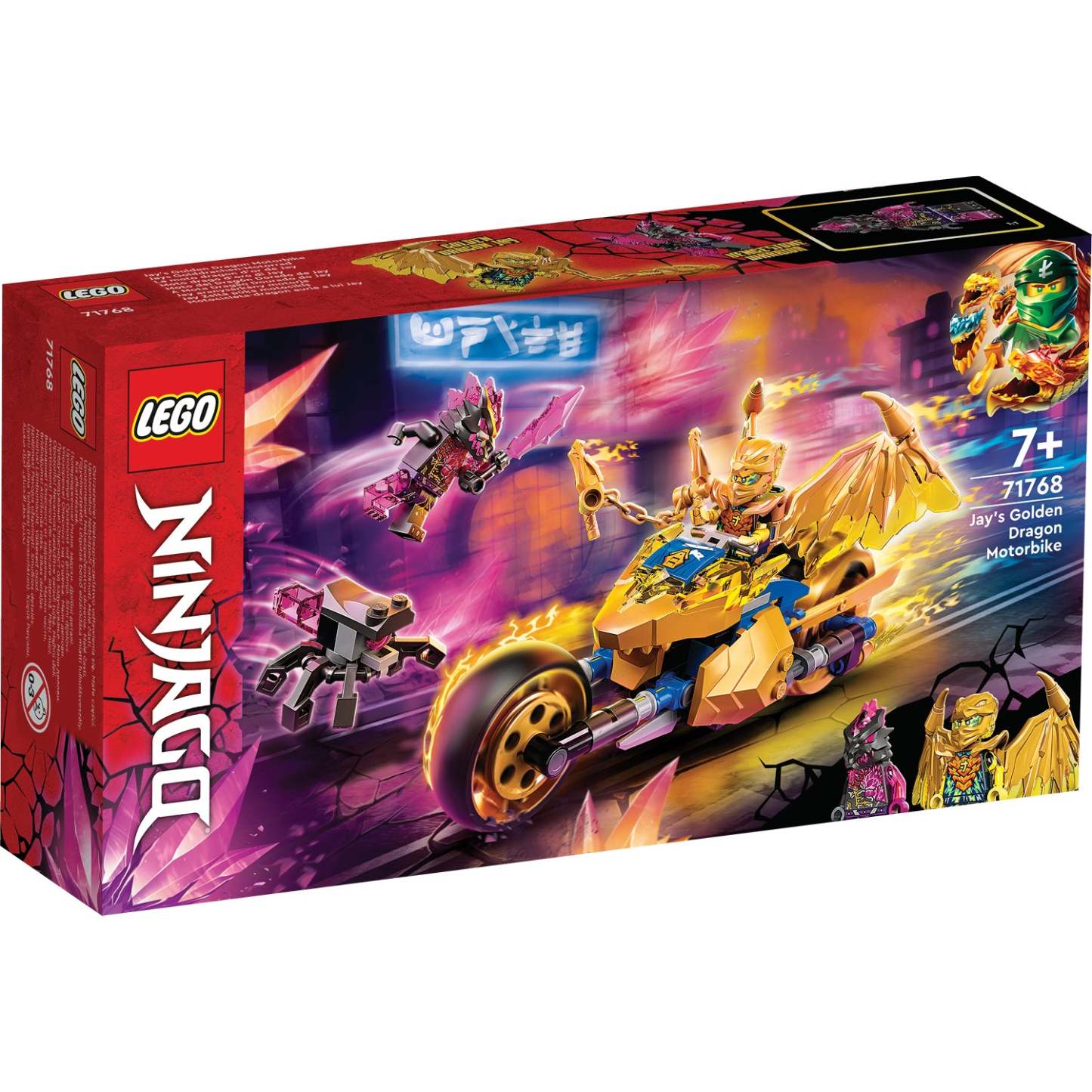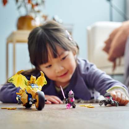 - NINJAGO® Motorbike playset – Kids can recreate exhilarating racing and battle scenes from the NINJAGO: Crystallized TV series with this LEGO® NINJAGO Jay’s Golden Dragon Motorbike (71768) set