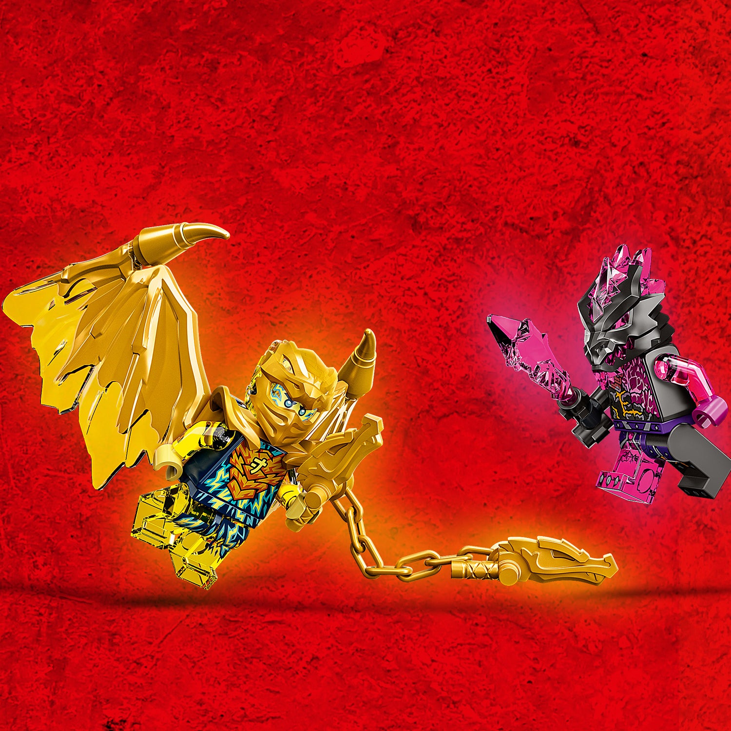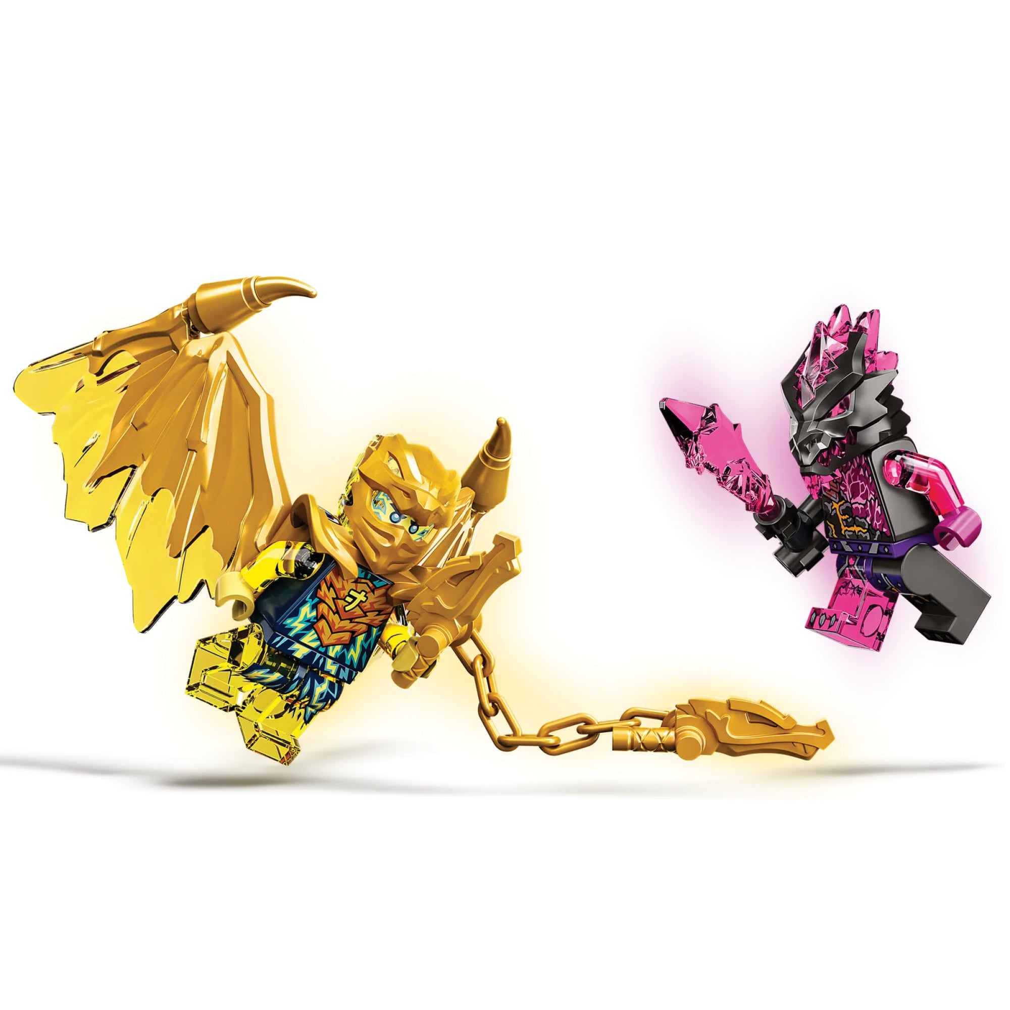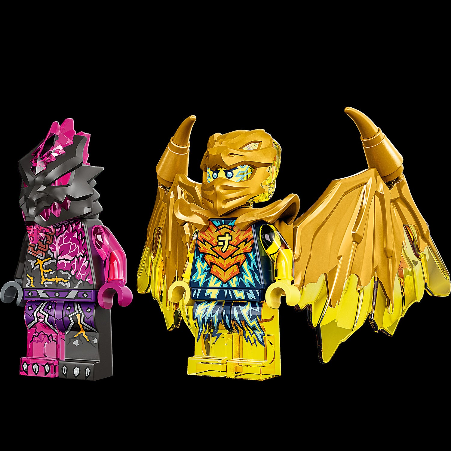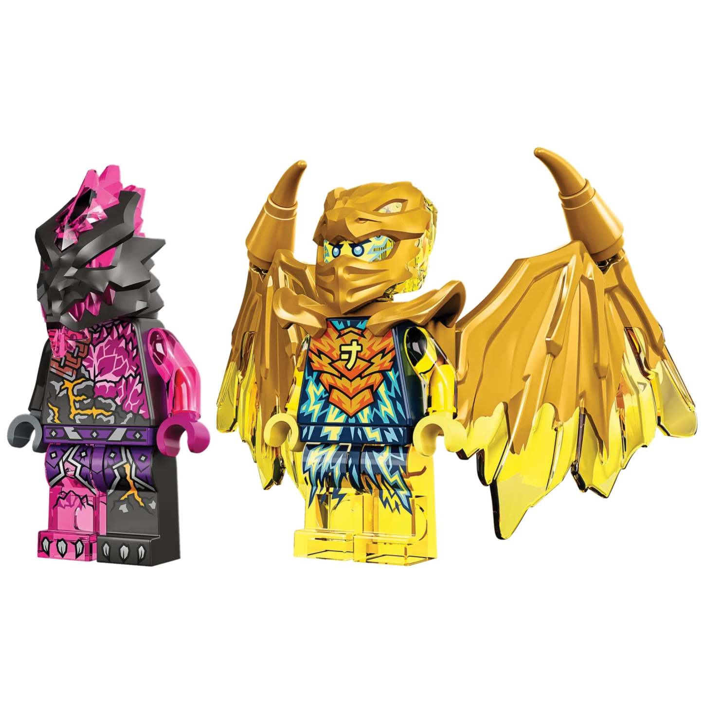 The ninja vehicle toy comes with 2 minifigures: Golden Dragon Jay, who can be strengthened with his elemental golden nunchucks weapon and a set of golden dragon wings adorned with spikes, and a Vengestone Warrior with a sword, who is accompanied by a crystal spider. Kids can play out adventures to help Golden Dragon Jay defend NINJAGO City from attack.
