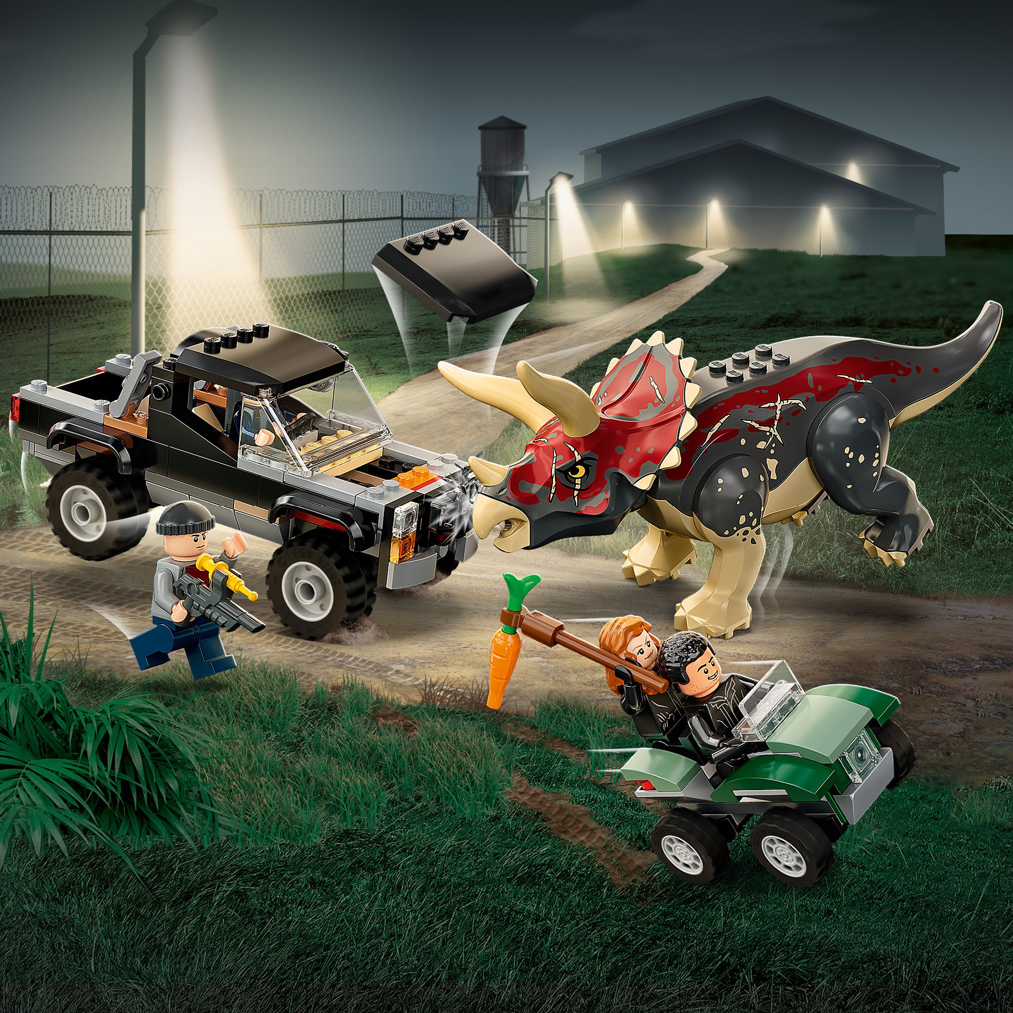 - Toy dinosaur and 4 minifigures – A posable Triceratops figure, Claire Dearing, Franklin Webb and 2 security guard minifigures, plus a tranquilliser and carrot accessory element for imaginative play
