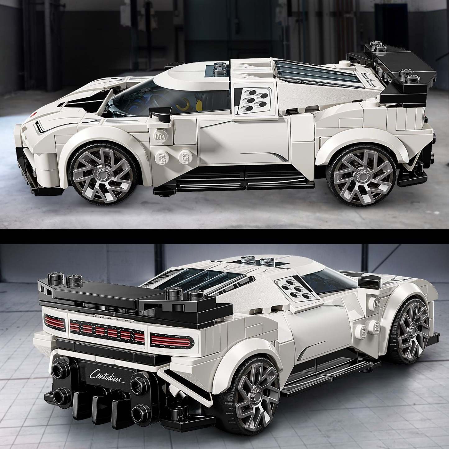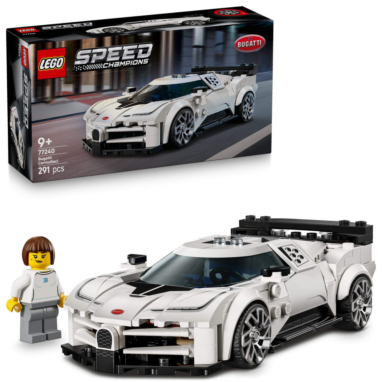 The Bugatti LEGO® car model includes the Centodieci hyper sports car’s 5 round air-intake features on the side, its unique alloy wheels, headlights, horseshoe radiator grille, overhanging rear wing and 4 rear exhaust pipes. The LEGO car set also comes with a Bugatti driver minifigure for kids to place behind the wheel and role-play action.