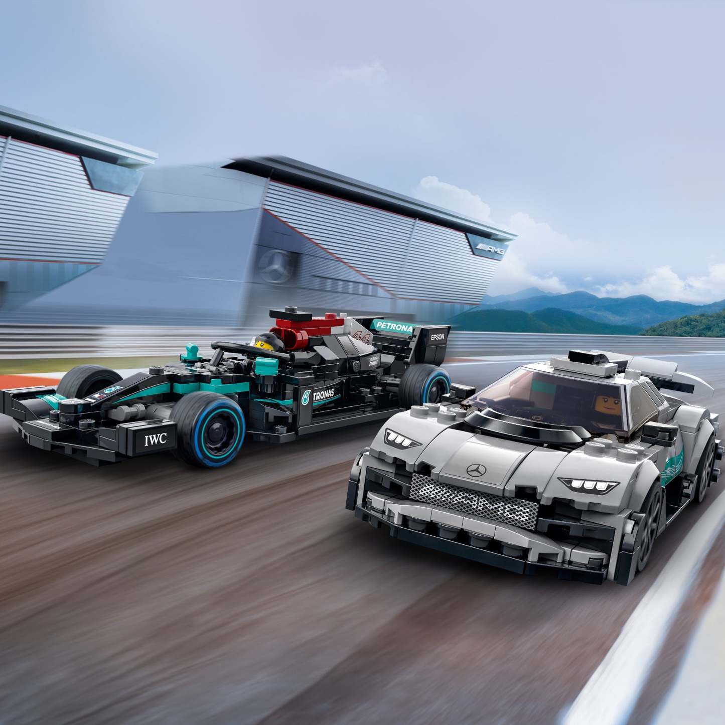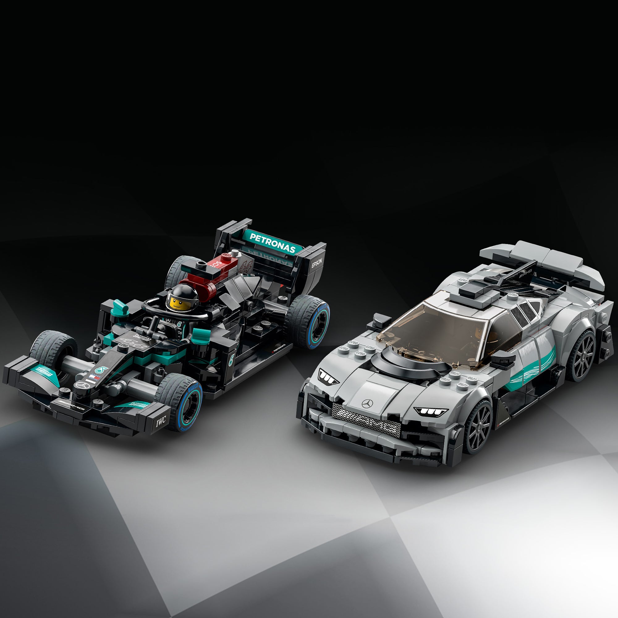 - What’s in the box? – All you need to build a LEGO® recreation of the Mercedes-AMG F1 W12 E Performance and AMG Project One, plus 2 driver minifigures, each with a racing helmet, wig and wrench