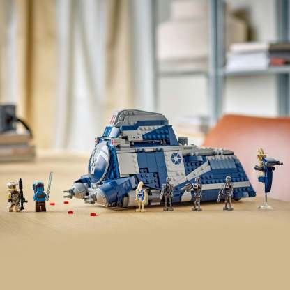 - Ready for action – The MTT has hidden wheels for smooth movement, a pilot cockpit, 2 stud shooters, a STAP speeder in the rear compartment and fold-up side panels to access interior details