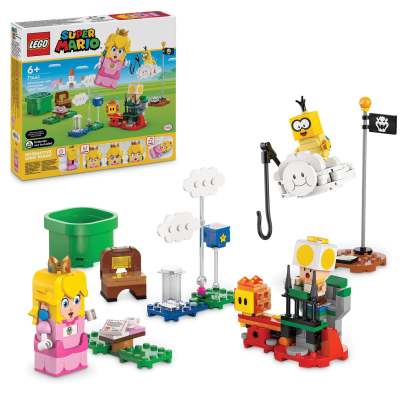 Join an iconic Super Mario™ character for a picnic and fly on a cloud to rescue the Yellow Toad with the Adventures with Interactive LEGO® Peach™ princess toy playset for kids (71441). A top Nintendo® gift for girls, boys and gamers aged 6 and up,the set features an interactive LEGO Peach figure, plus Lakitu, a Yellow Toad and a Lava Bubble. Travel from the Start Pipe to the Goal Pole triggering digital reactions from LEGO Peach and collecting coins along the way. Have a picnic, read a letter saying that the Yellow Toad has been captured, topple Lakitu from the cloud, and fly, flip and loop the loop on the cloud on the way to rescue the Yellow Toad. The buildable cloud toy also has a fishing pole for Lakitu to lift the Yellow Toad’s picnic seat.