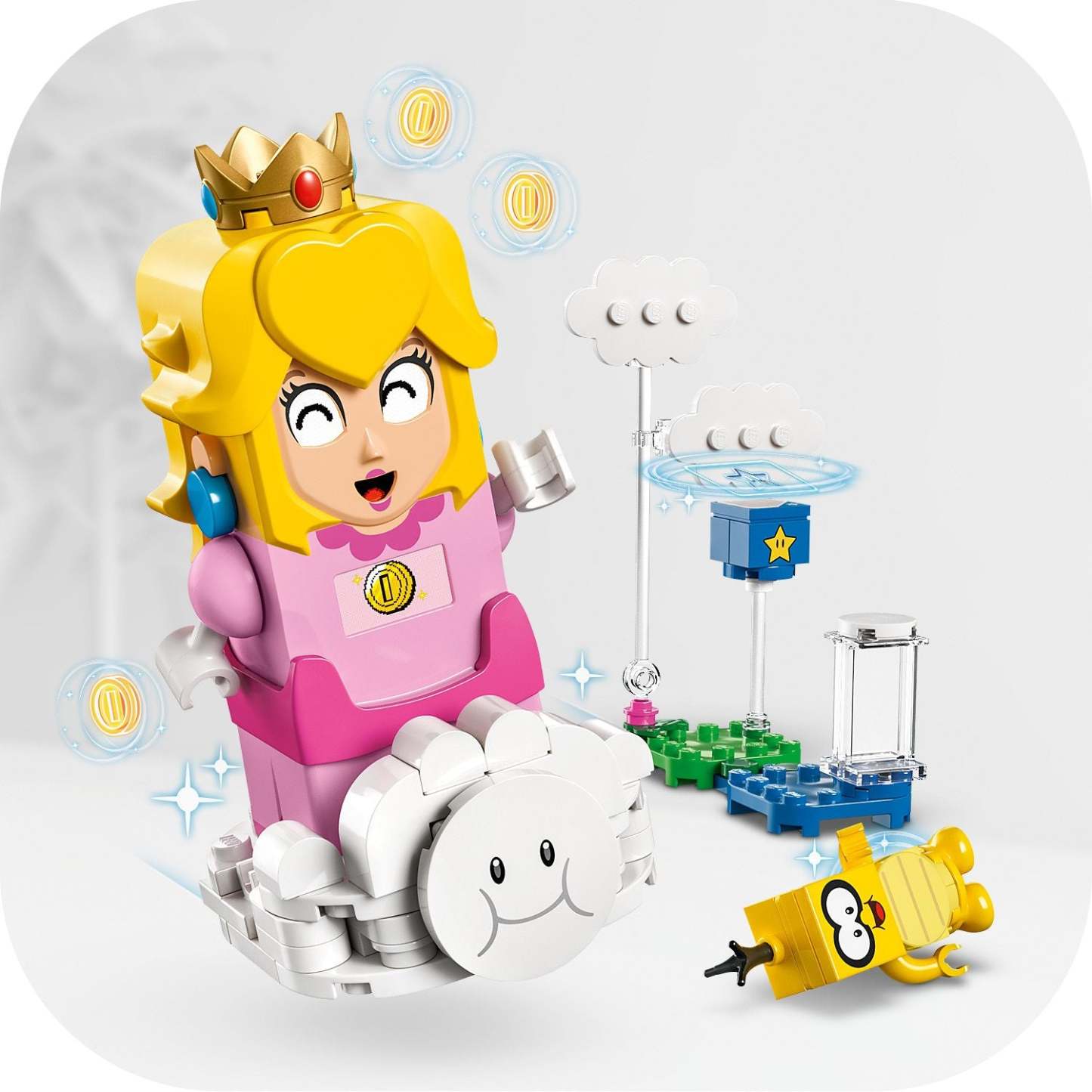 - Fun cloud toy – Help LEGO® Peach™ perform loop the loops and flips on the cloud to earn extra digital coins, and Lakitu can use the cloud to hook the picnic chair and capture the Yellow Toad
