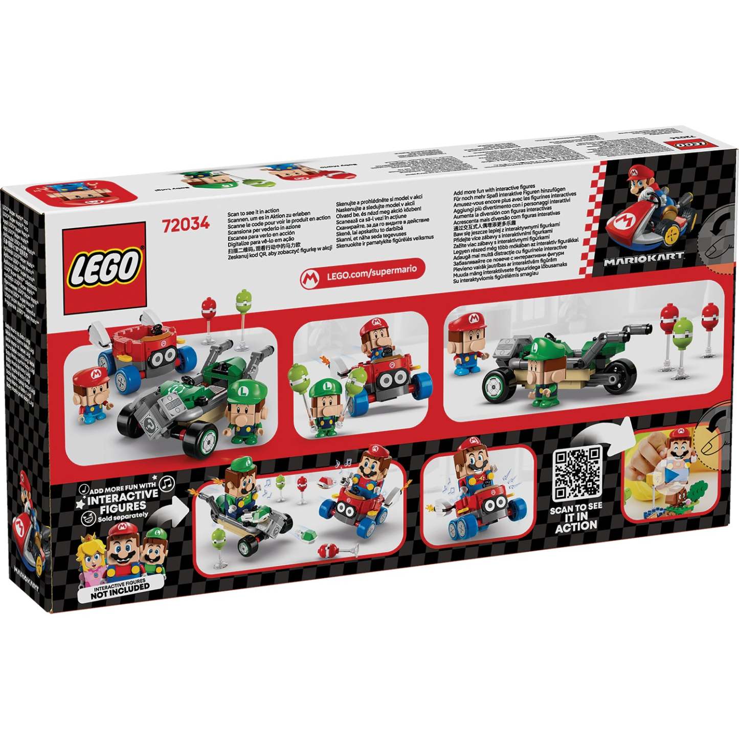 Place LEGO® Mario™, LEGO® Luigi™ or LEGO® Peach™ figure (from sets 71439, 71440 or 71441 – sold separately) in either kart for interactive play, triggering Mario Kart sound/visual effects for race starting, honking and drifting.