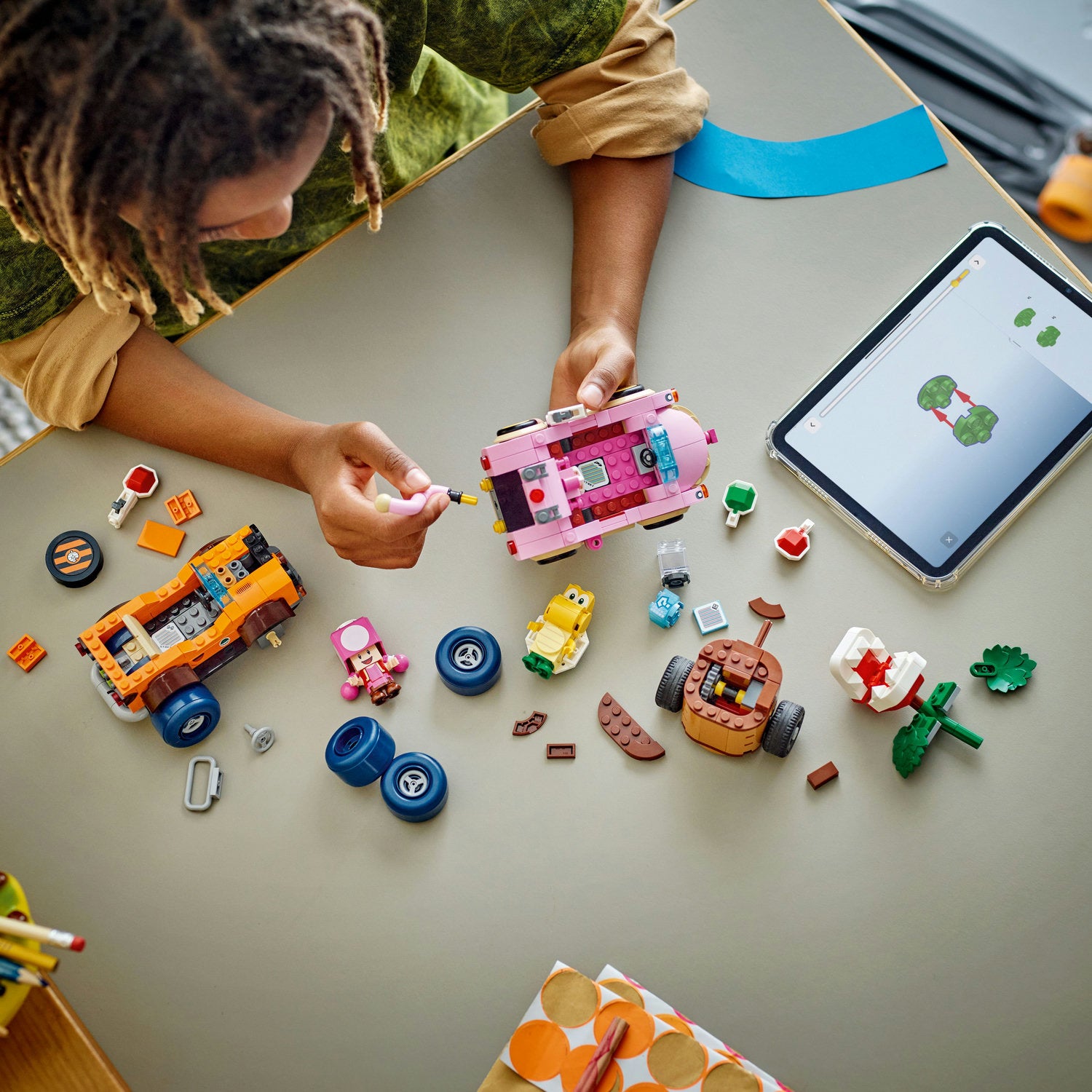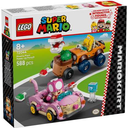 - LEGO® Super Mario™: Mario Kart™ toy playset for kids – Play out a thrilling Piranha Plant Power-Up Pursuit with a Koopa Troopa in the Tanooki Kart and Toadette in the Cat Cruiser