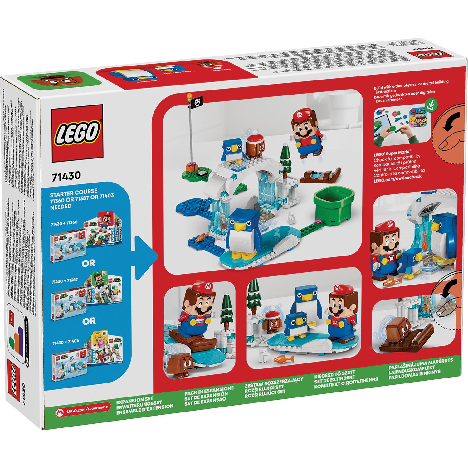 For interactive play, add a LEGO® Mario™, LEGO® Luigi™ or LEGO® Peach™ figure from a LEGO Super Mario Starter Course (71360, 71387 or 71403 – each sold separately) and earn digital coins for reuniting the baby penguin with its parent, defeating the Goomba, and more.