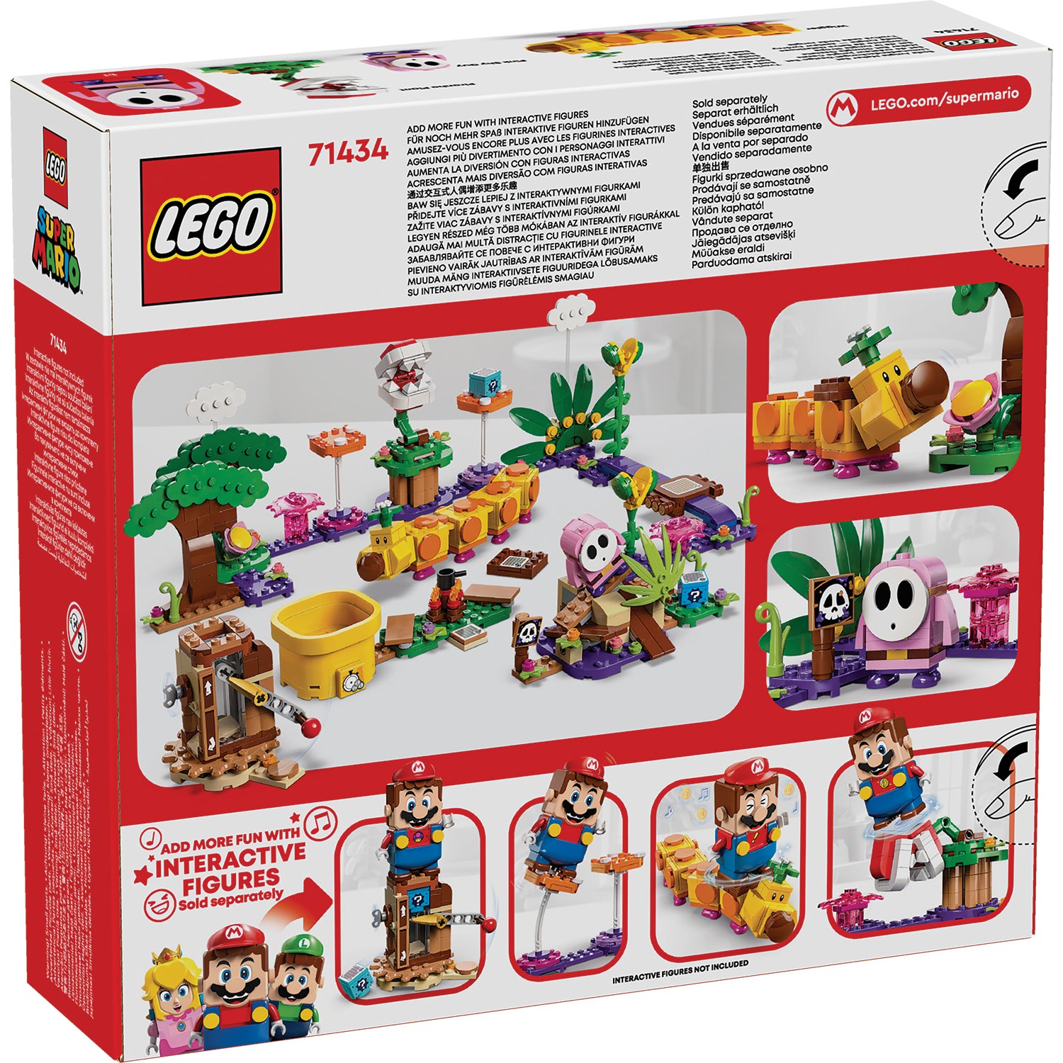Add a LEGO® Mario™, LEGO® Luigi™ or LEGO® Peach™ figure (from sets 71439, 71440 or 71441 – sold separately) to this toy playset for interactive play. Earn digital coins for riding the Wiggler, toppling the Pink Shy Guy, crossing the poison swamp on the raft, and more.