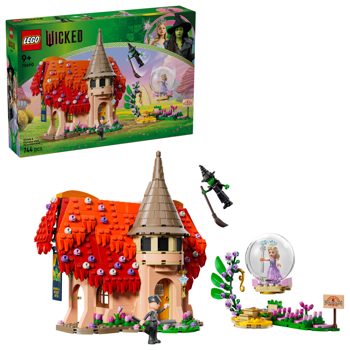 Wicked fans crown the Glinda minidoll “Glinda the Good” amid the tulips of Munchkinland then press the pedal, like she does in the movie, to surround her with the bubble. Or they imagine they’re Elphaba flying on her broomstick to Boq’s LEGO® toy Munchkin cottage. His LEGO house is topped by a pretty red brick-built roof, making this an eye-catching piece of kids’ room decor for girls and boys. Filled with toy accessories from the Wicked movies, this adventure gift is ideal for kids who love playhouse toys. Brimming with role-play toys, this fantasy gift has a kitchen, bedroom, den and bathroom with a sink, toilet and opening door. Set contains 744 pieces.