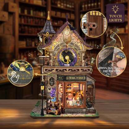 The Magic Moon Tower DIY miniature book-nook features a self-moving clock on top for a lively, steampunk touch. Tap the button once for lights + music, tap again for lights-only (silent mode)—perfect for late-night ambience. Crafted micro-details and warm LEDs turn your shelf into a tiny club where time and melody meet.