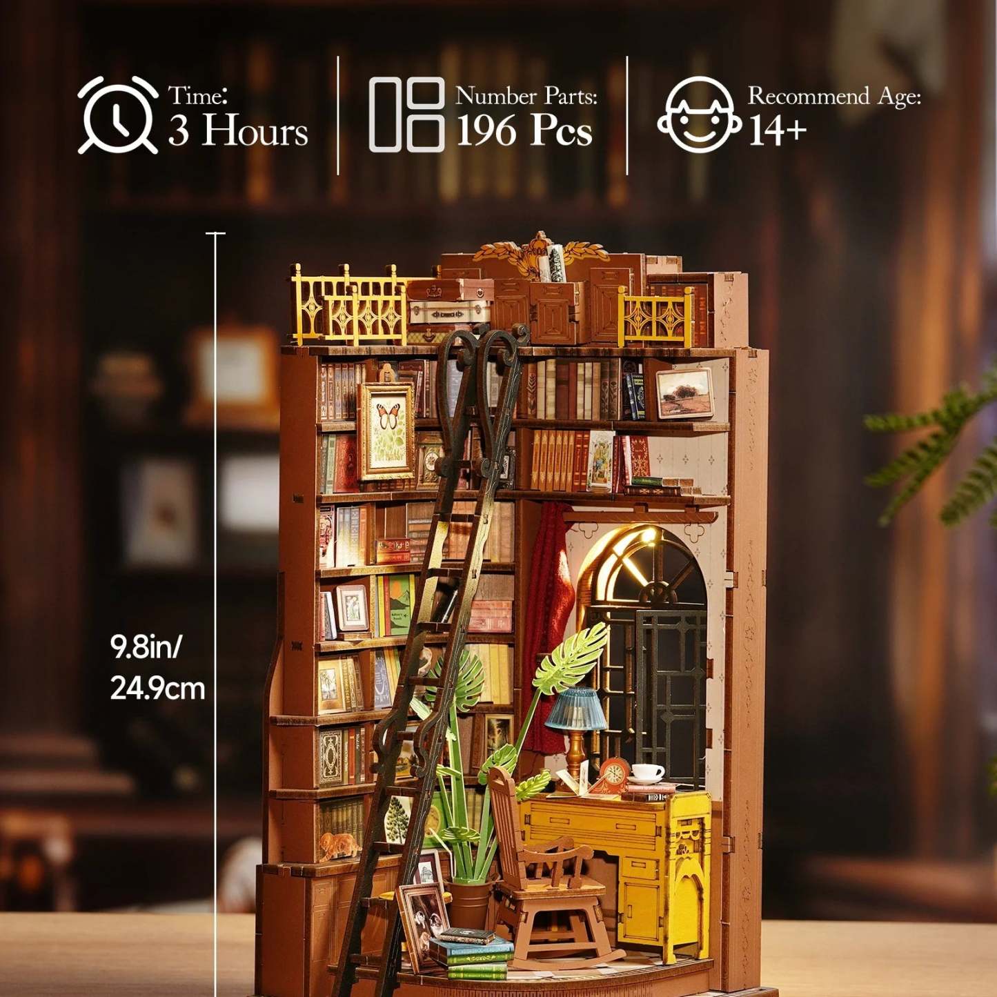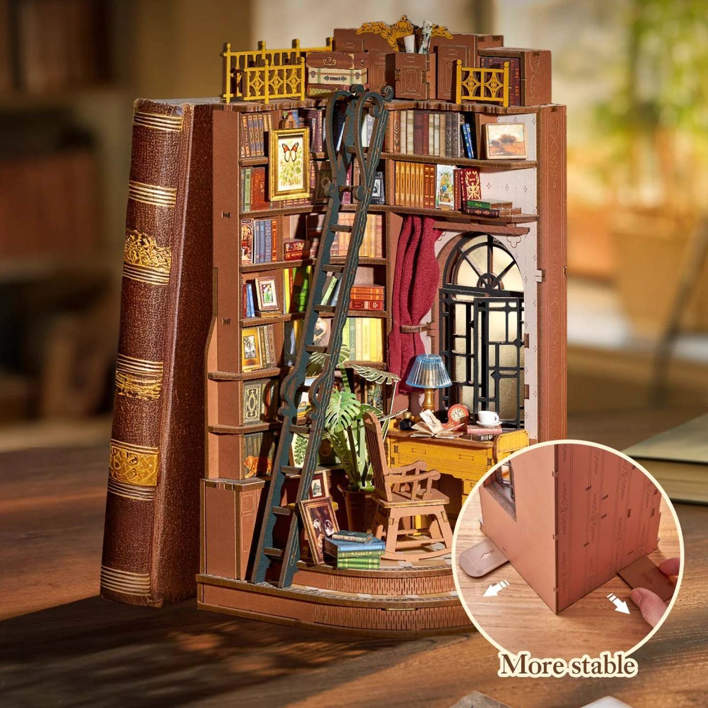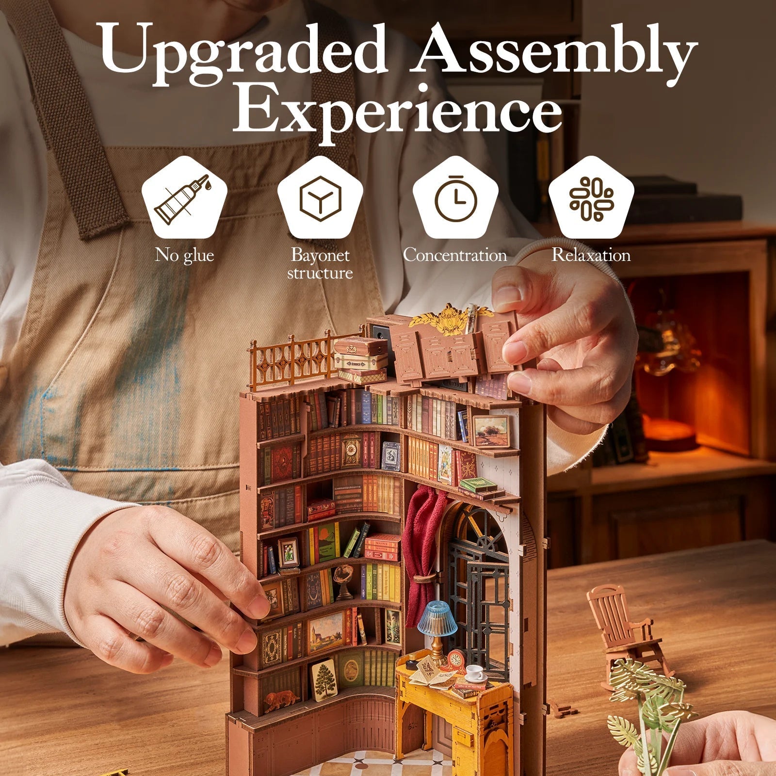 Glue-free and beginner-friendly, Silent Corner Study snaps together in about 3–4 hours. Hidden feet and a reinforced frame keep books upright, while arched windows, carved shelves, and leather-spine replicas bring a vintage British library vibe. Tap to switch warm LED on (2×AA): enjoy cozy night reading ambience on your shelf.