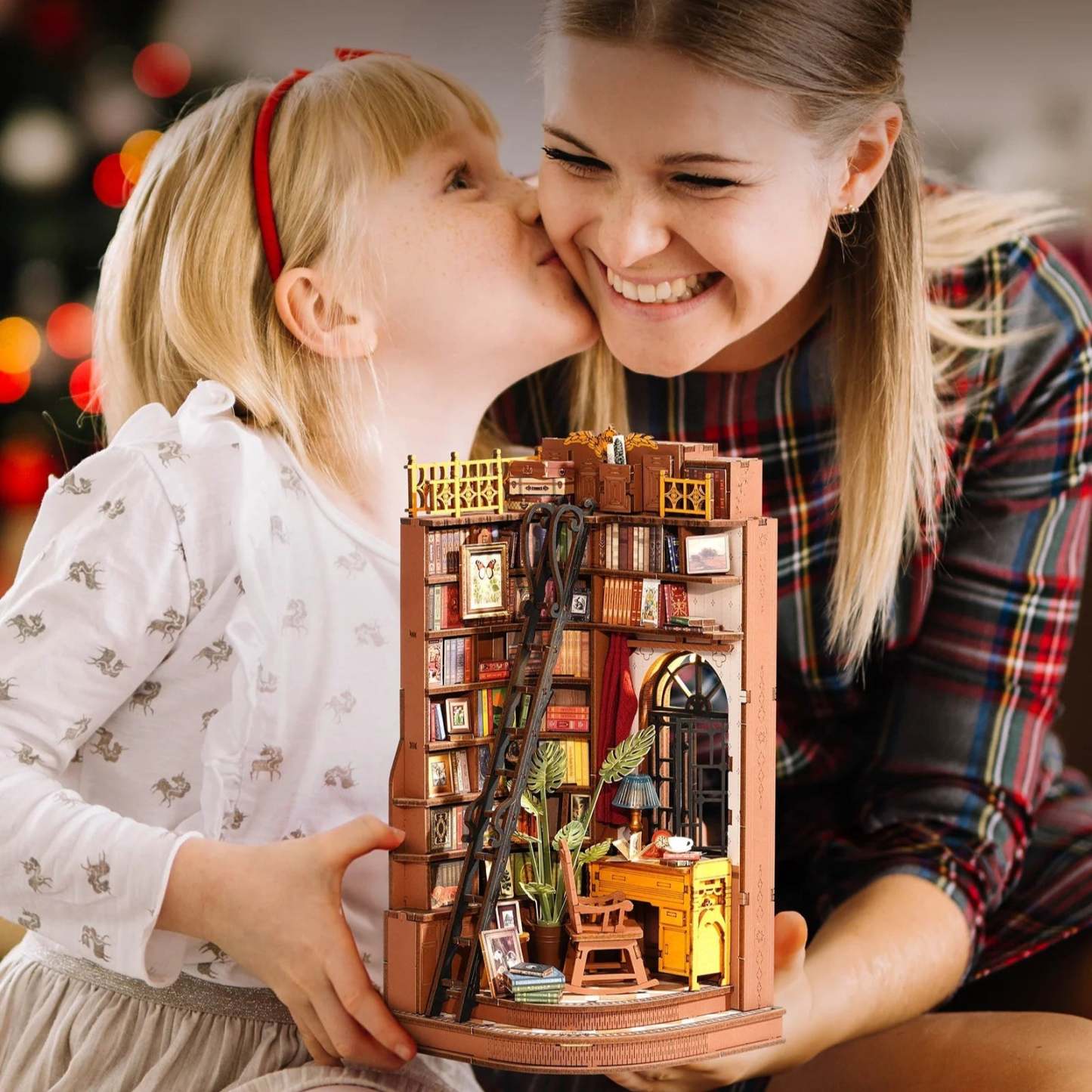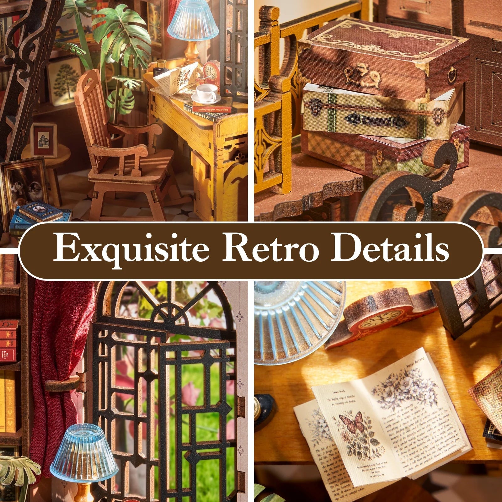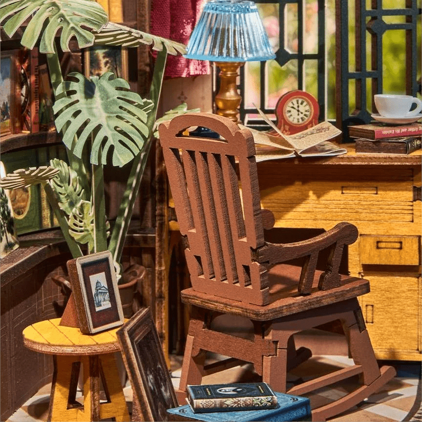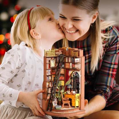 Glue-free and beginner-friendly, Silent Corner Study snaps together in about 3–4 hours. Hidden feet and a reinforced frame keep books upright, while arched windows, carved shelves, and leather-spine replicas bring a vintage British library vibe. Tap to switch warm LED on (2×AA): enjoy cozy night reading ambience on your shelf.