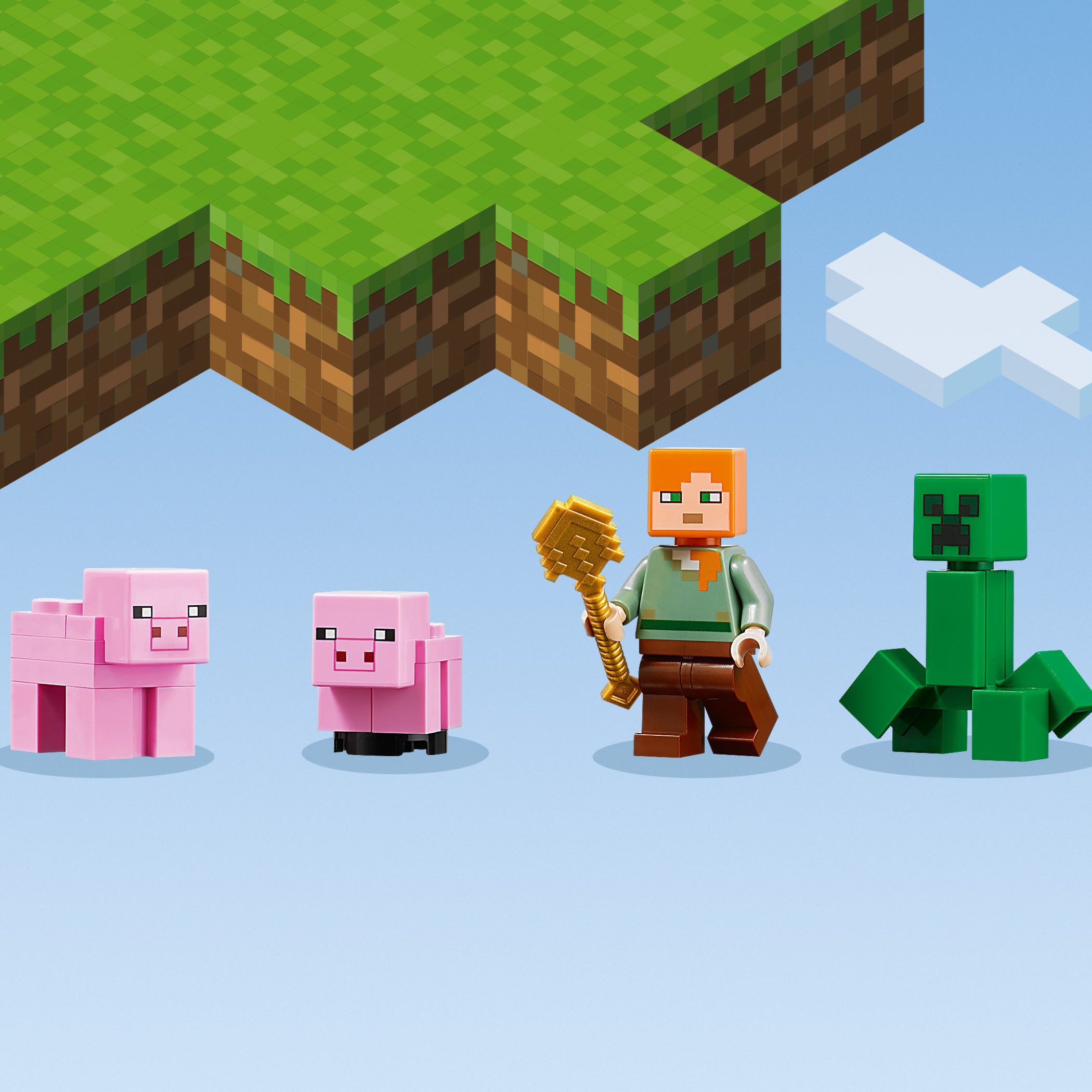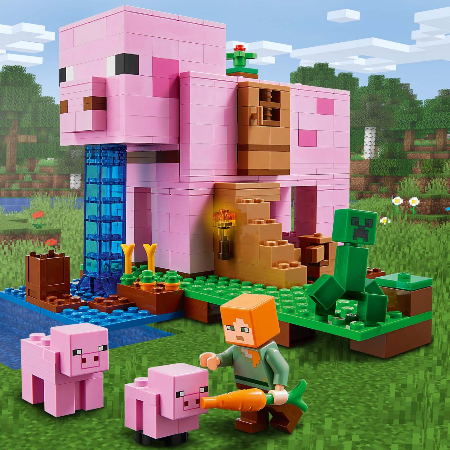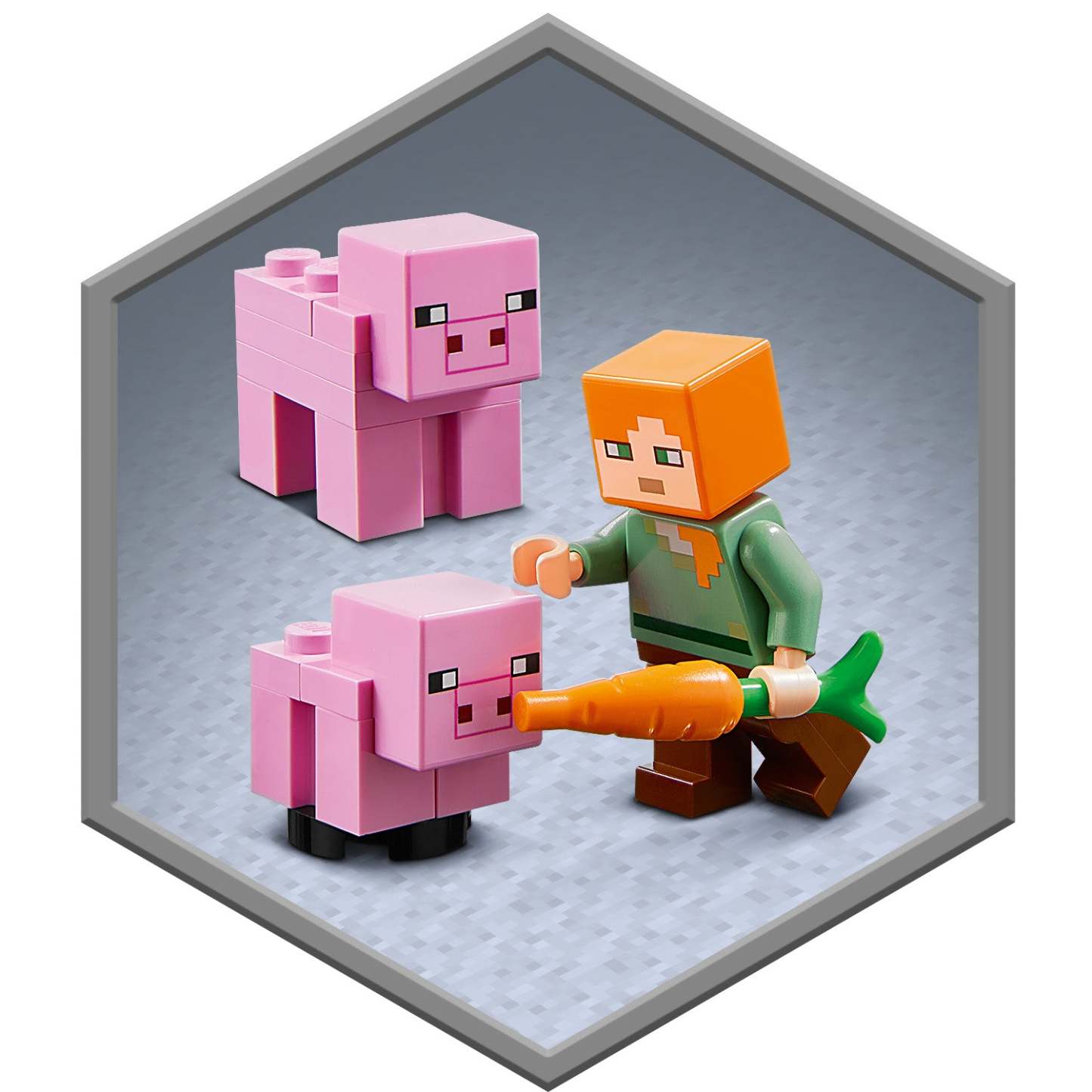 - Authentic LEGO® Minecraft™ building playset featuring popular gaming character Alex, an iconic Creeper™, 2 pigs, accessories for Alex and carrots for the pigs.
