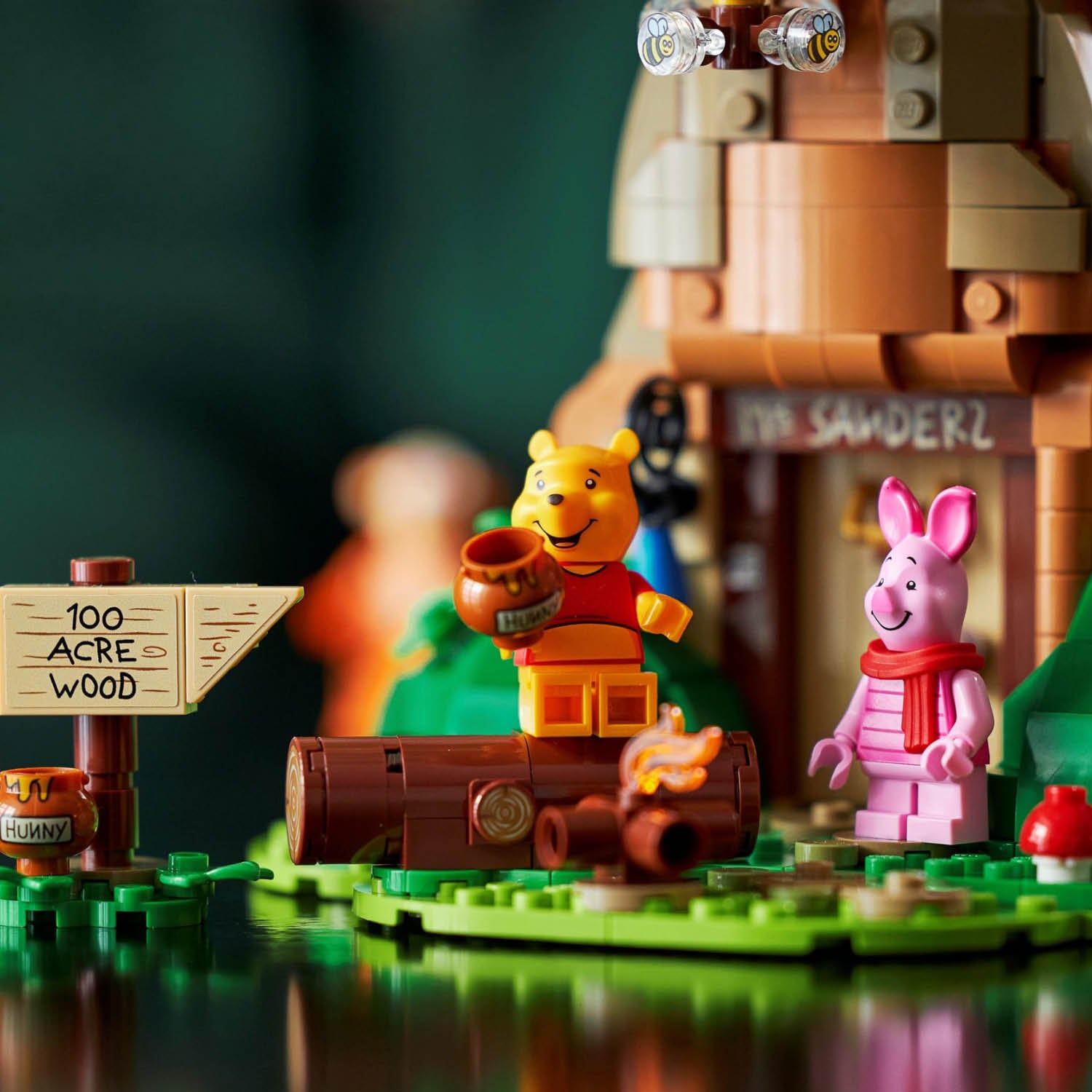 - Sit Pooh Bear on the log by the buildable fire and, with his balloon, help him ‘float’ up to see the bees ‘buzzing’ around the 2 beehives in the tree.