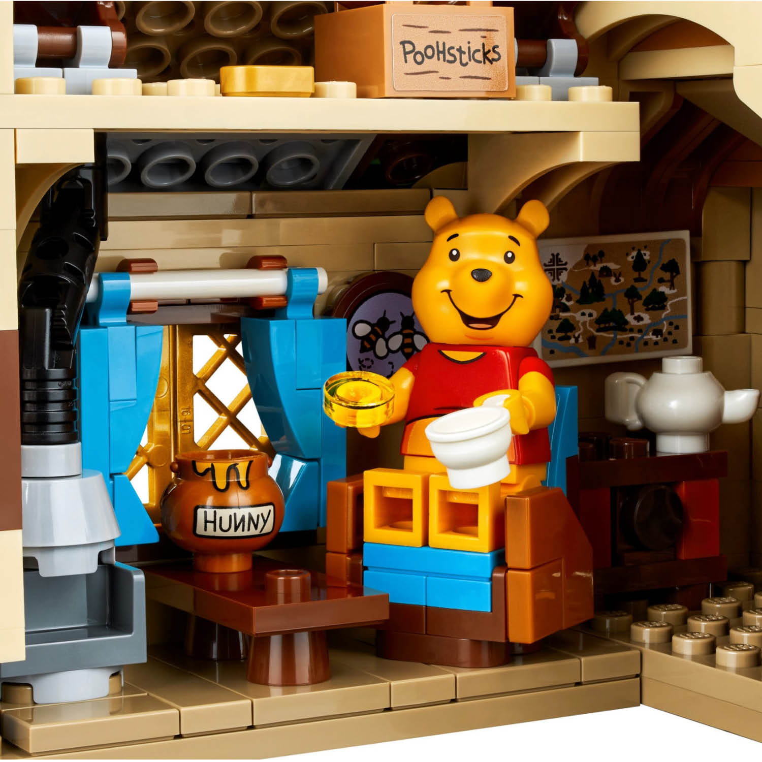 - The house opens at the back for easy access to the authentic accessories inside including a buildable armchair, Pooh-coo clock and elements including a Pooh Bear storybook, honey pots and Poohsticks.