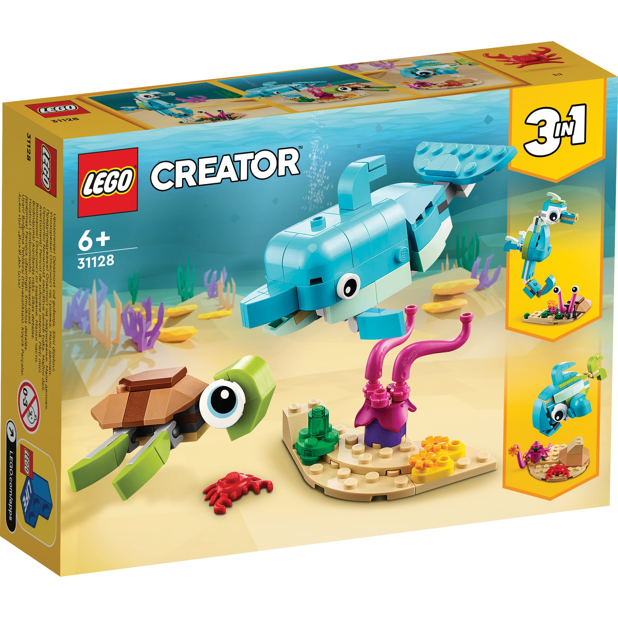 LEGO® fans aged 6 and up can dive to the bottom of the sea to enjoy adventures with this 3in1 Dolphin and Turtle (31128) building set. It features a baby dolphin with posable body, flippers, jaw and tail, and a baby sea turtle with posable flippers and head, both set on a display stand.