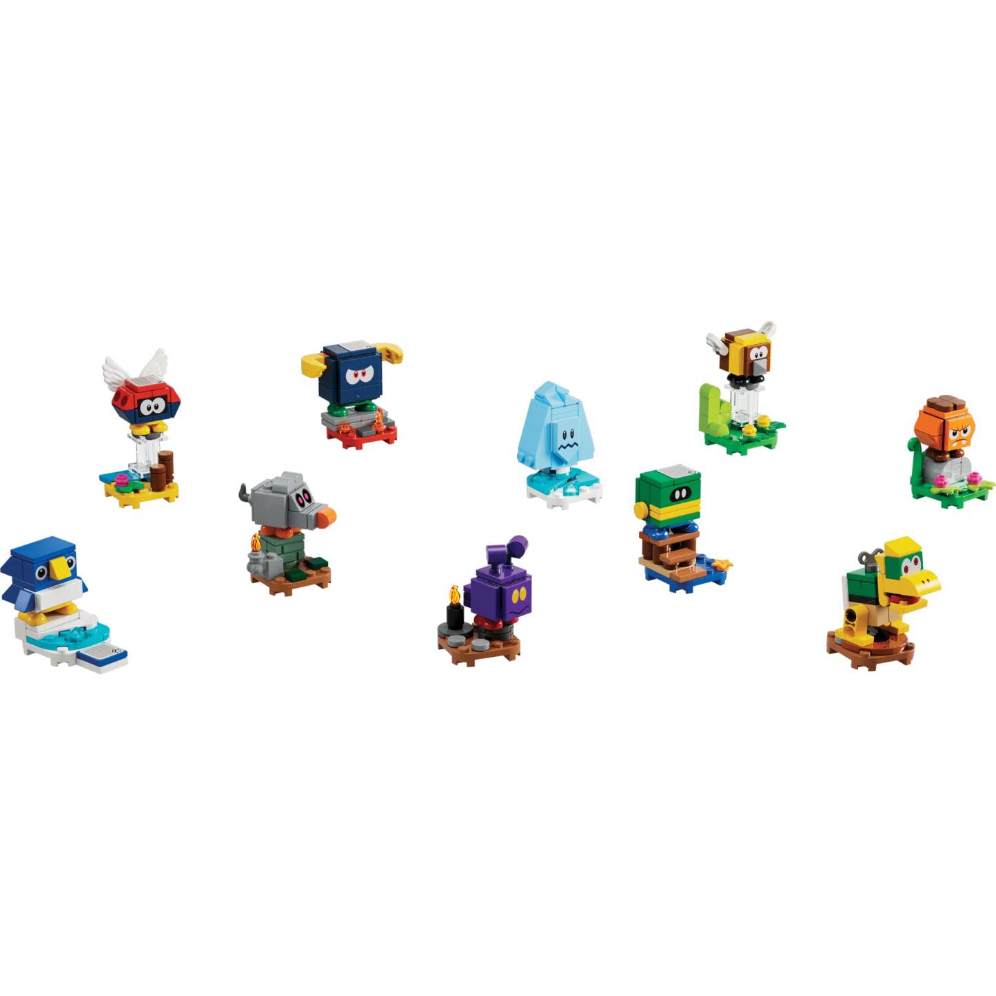 - 10 to collect, build and play with – A Mechakoopa, Para-Biddybud, Stingby, Bully, Freezie, Ant Trooper, Goombrat, Coin Coffer, Scaredy Rat and a baby penguin